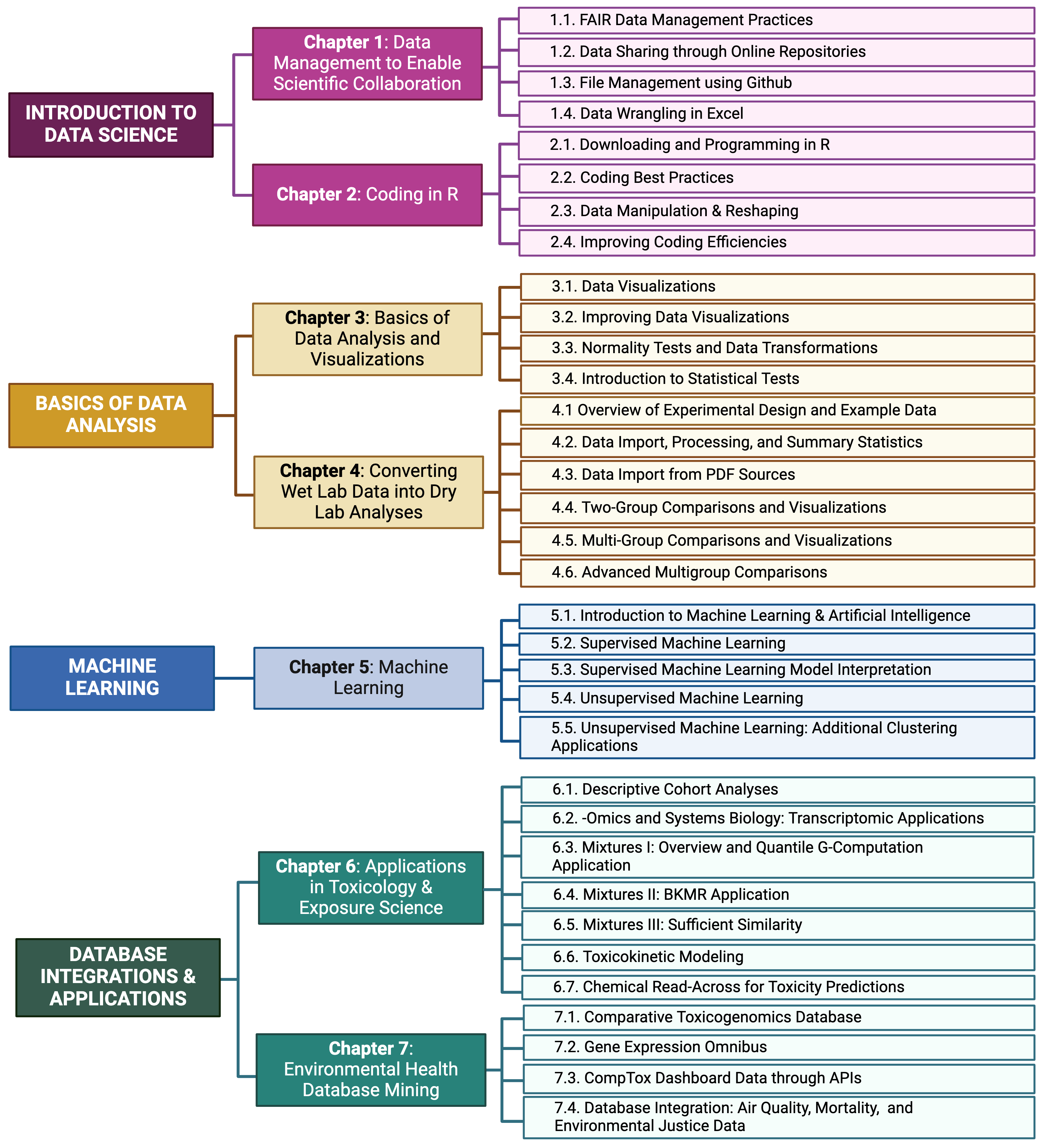 Training modules were developed to provide applications-driven examples of data organization and analysis methods that can be used to address environmental health questions. Target audiences for these modules include students and professionals in academia, government, and industry that are interested in expanding their skillset. Modules were developed by study coauthors using annotated script formatted for R/RStudio coding language and interface and are now organized into seven chapters. The first group of modules focuses on introductory data science, which included the following topics: data management and sharing practices, file management, and basic data wrangling. The second chapter of modules provides an overview of scripting, using R as the example language. Topics span downloading and programming in R, coding best practices, data manipulation and reshaping, and coding efficiencies. The third chapter demonstrates methods for basic data analysis and visualizations, spanning an introduction to data visualizations, methods to improve data visualizations, normality tests and data transformations, and introduction to statistical tests. The fourth chapter focuses on the translation of wet lab data into dry lab analyses. Topics in this chapter include an introduction to key experimental features and terms; data importing, cleaning and summary statistics from wet lab sources; two-group comparisons and visualizations; multigroup comparisons and visualizations; advanced multigroup comparisons; and advanced data export and sharing. The fifth chapter provides an introduction to machine learning and artifical intelligence (ML/AI). Topics in this chapter include a general introduction of ML/AI and then provides examples of unsupervised machine learning methods, supervised machine learning methods, and interpretation of developed ML models. The sixth chapter provides applications in toxicology and exposure science, spanning descriptive cohort analyses; -omics analyses; mixtures methodologies; toxicokinetic modeling; and chemical read-across.The seventh chapter delves into examples of environmental health database mining, and highlights the helpful databases of Comparative Toxicogenomics Database, Gene Expression Omnibus, Computational Toxicology Dashboard access through APIs, and database integration using geospatial methods.
