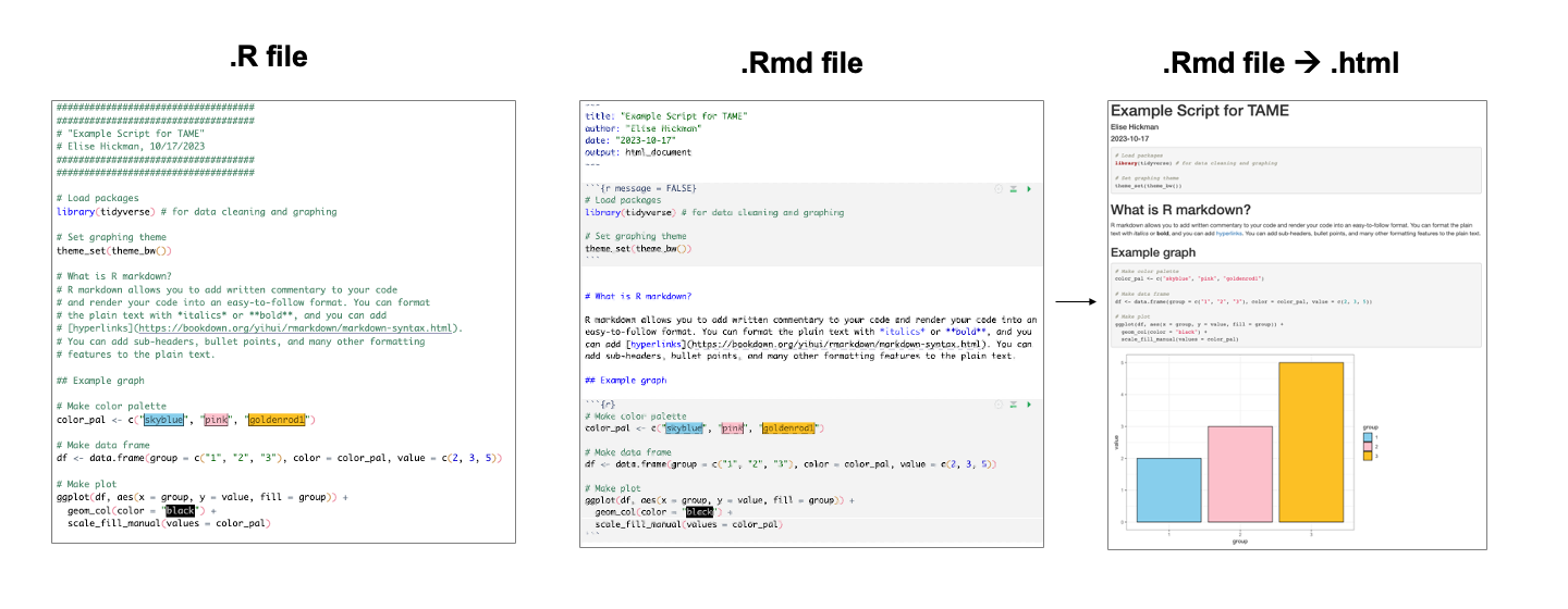 Two of the most common scripting file types applicable to the R language are .R (normal R files) and .Rmd (R Markdown). Normal R files appear as plain text and can be used for running any normal R code. R Markdown files are used for more intensive documentation of code and allow for a combination of code, non-code text explaining the code, and viewing of code output, tables, and figures that are rendered together into an output file (typically .html, although other formats such as .pdf are also offered). For example, TAME is coded using R Markdown, which allows us to include blocks of non-code text, hyperlinks, annotated code, schematics, and output figures all in one place. We highly encourage the use of R Markdown as the default scripting file type for R-based projects because it produces a polished final document that is easy for others to follow, whereas .R files are more appropriate for short, one-off analyses and writing in-depth functions and packages. However, code executed in normal .R files and R Markdown will produce the same results, and ultimately, which file type to use is personal preference.