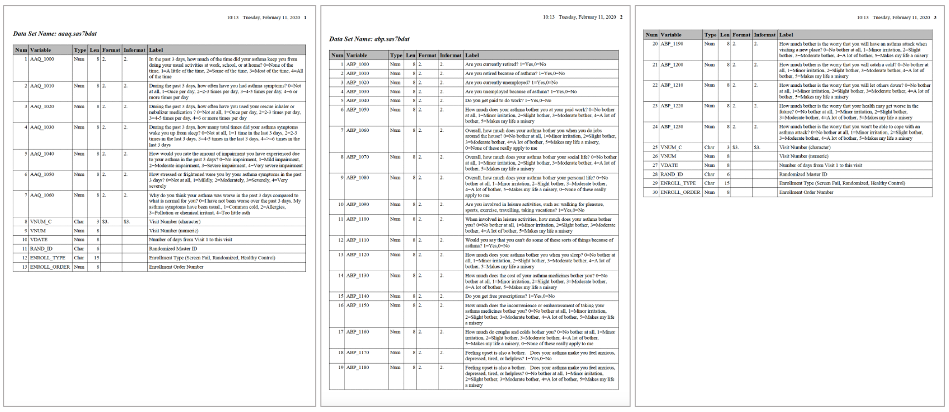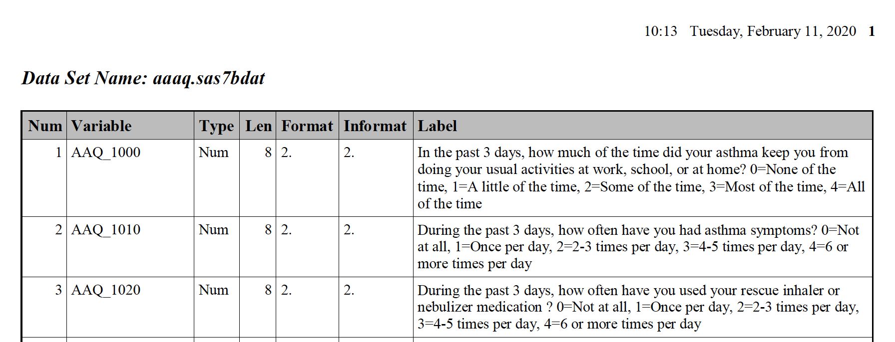 ## [1] " 10:13 Tuesday, February 11, 2020 1\n\n\nData Set Name: aaaq.sas7bdat\n\nNum Variable Type Len Format Informat Label\n 1 AAQ_1000 Num 8 2. 2. In the past 3 days, how much of the time did your asthma keep you from\n doing your usual activities at work, school, or at home? 0=None of the\n time, 1=A little of the time, 2=Some of the time, 3=Most of the time, 4=All\n of the time\n 2 AAQ_1010 Num 8 2. 2. During the past 3 days, how often have you had asthma symptoms? 0=Not\n at all, 1=Once per day, 2=2-3 times per day, 3=4-5 times per day, 4=6 or\n more times per day\n 3 AAQ_1020 Num 8 2. 2. During the past 3 days, how often have you used your rescue inhaler or\n nebulizer medication ? 0=Not at all, 1=Once per day, 2=2-3 times per day,\n 3=4-5 times per day, 4=6 or more times per day\n 4 AAQ_1030 Num 8 2. 2. During the past 3 days, how many total times did your asthma symptoms\n wake you up from sleep? 0=Not at all, 1=1 time in the last 3 days, 2=2-3\n times in the last 3 days, 3=4-5 times in the last 3 days, 4=>=6 times in the\n last 3 days\n 5 AAQ_1040 Num 8 2. 2. How would you rate the amount of impairment you have experienced due\n to your asthma in the past 3 days? 0=No impairment, 1=Mild impairment,\n 2=Moderate impairment, 3=Severe impairment, 4=Very severe impairment\n 6 AAQ_1050 Num 8 2. 2. How stressed or frightened were you by your asthma symptoms in the past\n 3 days? 0=Not at all, 1=Mildly, 2=Moderately, 3=Severely, 4=Very\n severely\n 7 AAQ_1060 Num 8 2. 2. Why do you think your asthma was worse in the past 3 days compared to\n what is normal for you? 0=I have not been worse over the past 3 days. My\n asthma symptoms have been usual., 1=Common cold, 2=Allergies,\n 3=Pollution or chemical irritant, 4=Too little asth\n 8 VNUM_C Char 3 $3. $3. Visit Number (character)\n 9 VNUM Num 8 Visit Number (numeric)\n 10 VDATE Num 8 Number of days from Visit 1 to this visit\n 11 RAND_ID Char 6 Randomized Master ID\n 12 ENROLL_TYPE Char 15 Enrollment Type (Screen Fail, Randomized, Healthy Control)\n 13 ENROLL_ORDER Num 8 Enrollment Order Number\n"