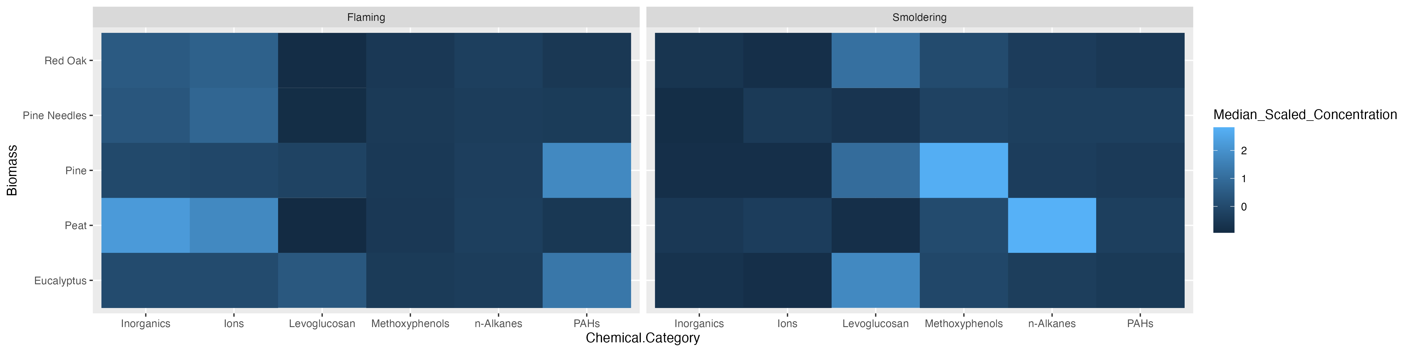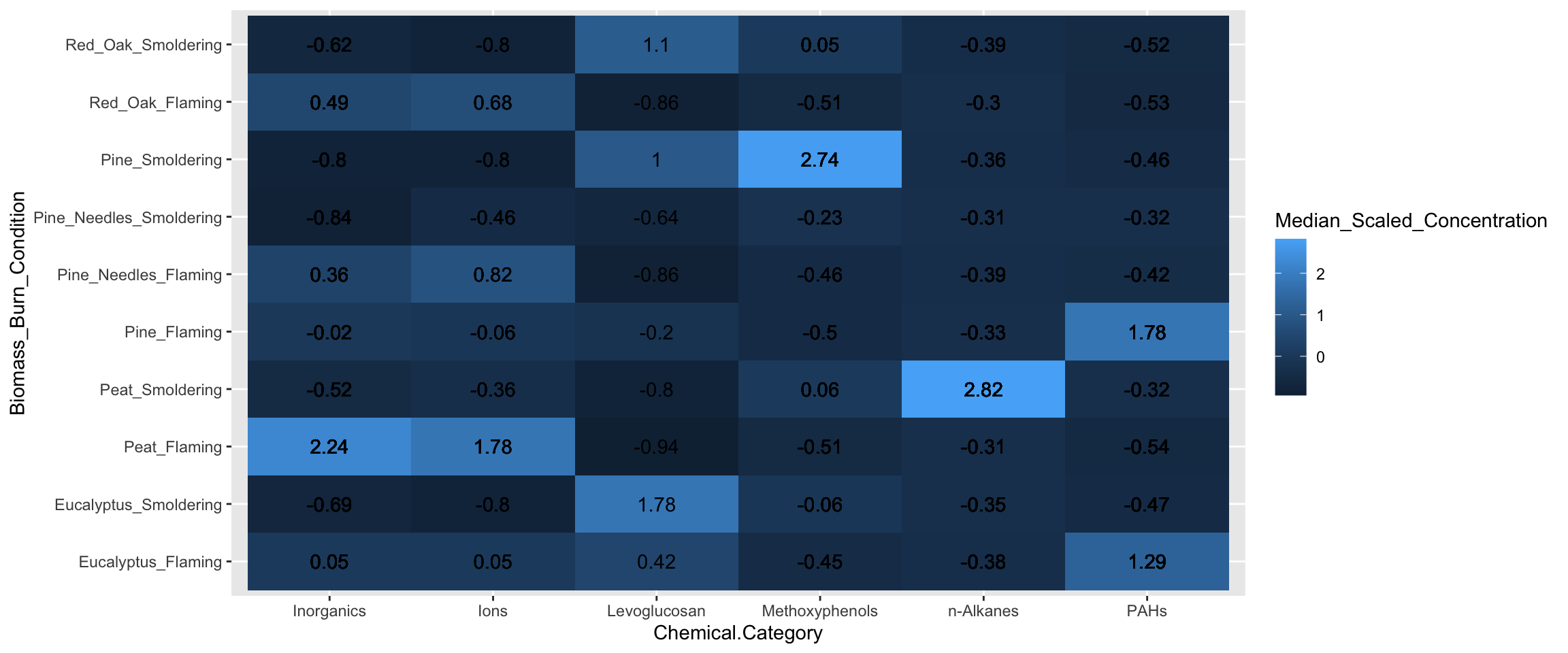 In this example, we also plan to display the median scaled concentration value within the heatmap as an additional layer of helpful information to aid in interpretation. To do so, we’ll need to take the median chemical concentration for each biomass burn condition within each chemical category. However, since we want ggplot() to visualize the median scaled values with the color of the tiles this step was already necessary.