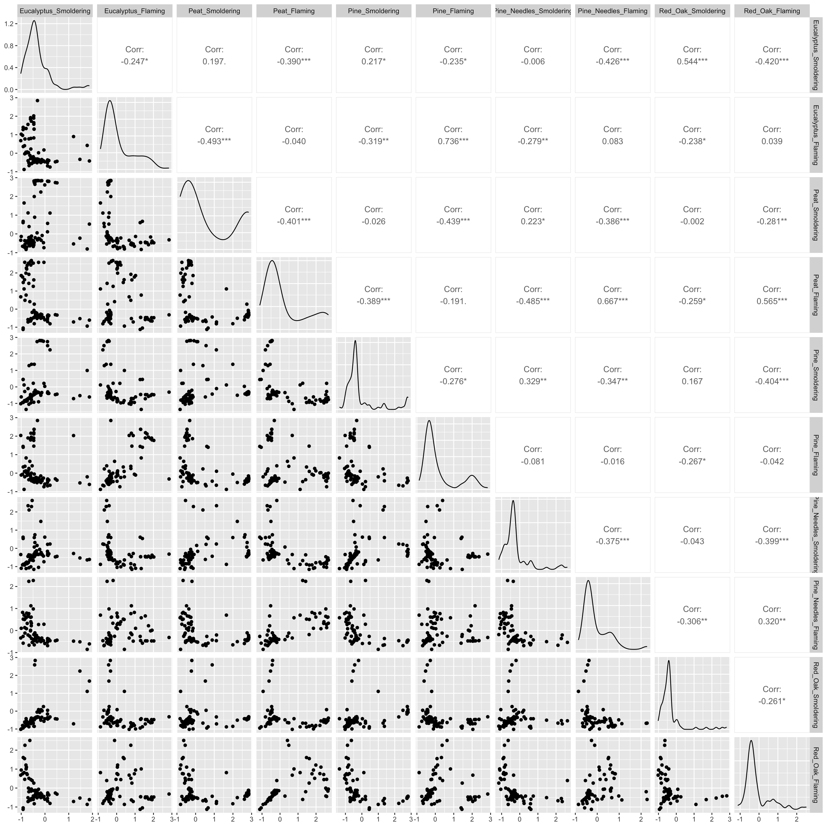 # ggpairs(wide_scaled_data, upper = list(continuous = wrap(ggally_cor, method = "spearman")))Many of these biomass burn conditions have significant correlations denoted by the asterisks.