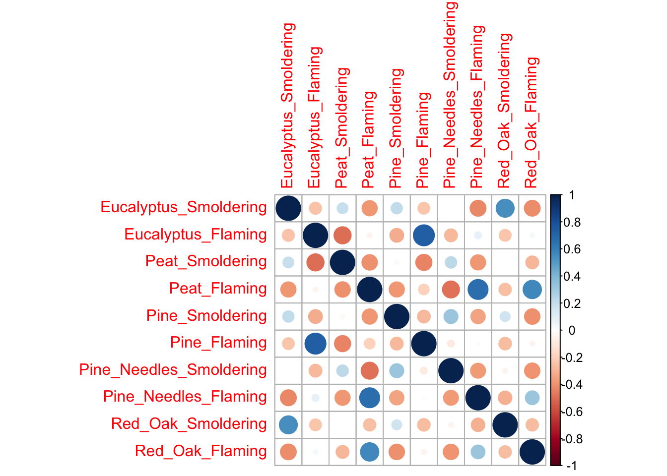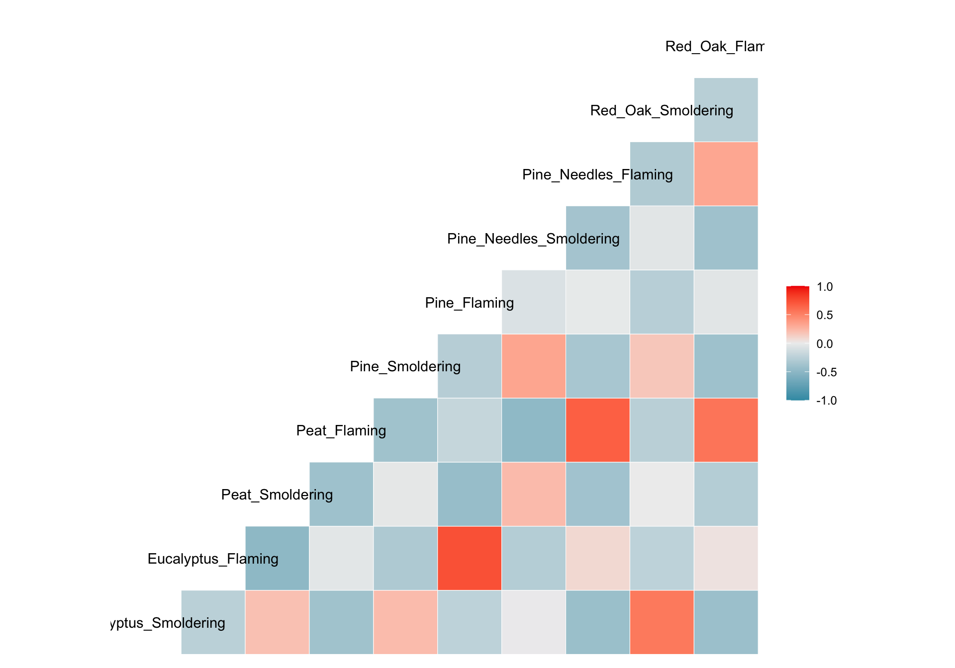 Answer: There is low correlation between many of the variables (-0.5 < correlation value < 0.5). Eucalyptus flaming and pine flaming are significantly positively correlated along with peat flaming and pine needles flaming (correlation value ~0.7 and p value < 0.001).
