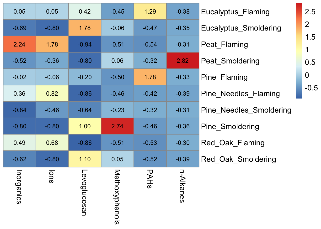 Answer: Peat flaming has the highest concentrations of inorganics and ions. Eucalyptus smoldering has the highest concentrations of levoglucosans. Pine smoldering has the highest concentrations of methoxyphenols. Peat smoldering has the highest concentrations of n-alkanes. Pine needles smoldering has highest concentrations of PAHs.