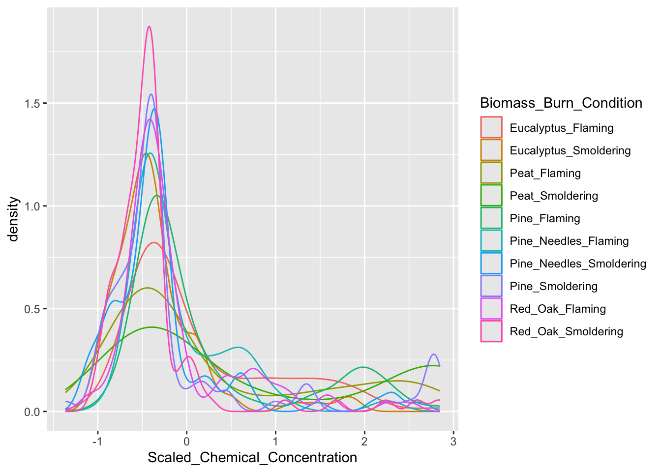 In this example of a density plot, we’ll visualize the distributions of chemical concentration data on the x axis. A density plot automatically displays where values are concentrated on the y axis. Additionally, we’ll want to have multiple density plots within the same figure for each biomass burn condition.