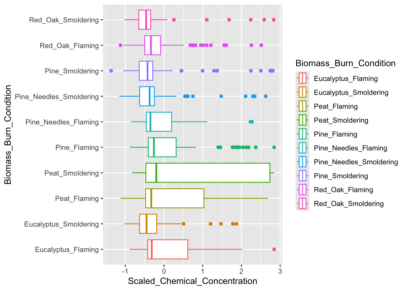 For this example, we will normalize the chemical concentration dataset using a basic scaling and centering procedure using the base R function, scale(). This algorithm results in the normalization of a dataset using the mean value and standard deviation. This scaling step will convert chemical concentration values in our dataset into normalized values across samples, such that each chemical’s concentration distributions are more easily comparable between the different biomass burn conditions.