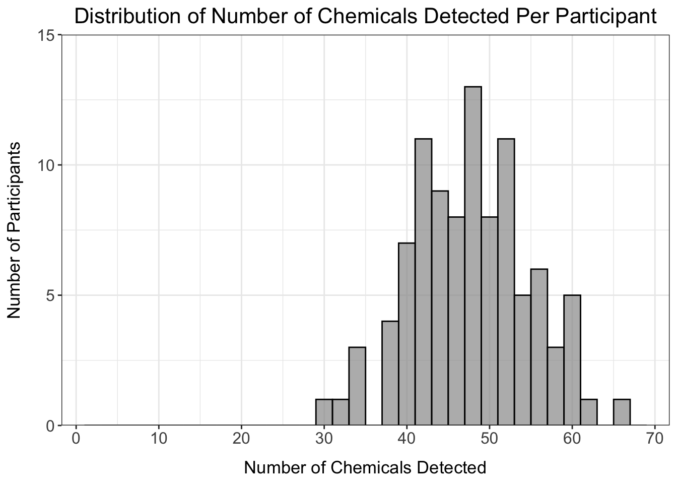 From this histogram, we can see that the number of chemicals detected per participant ranges from about 30-65 chemicals, with no participants standing out as being well above or below the distribution.