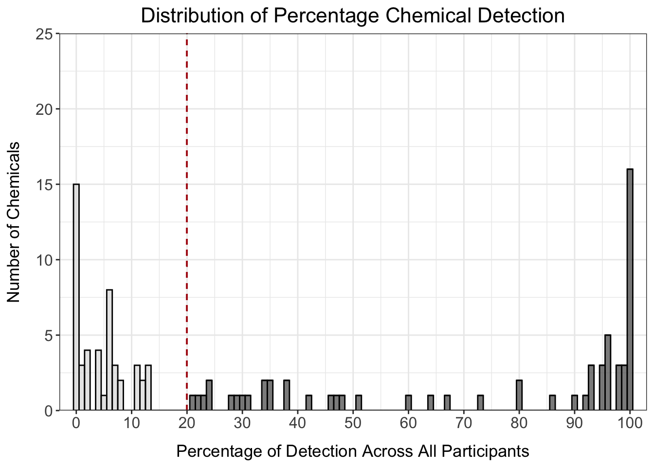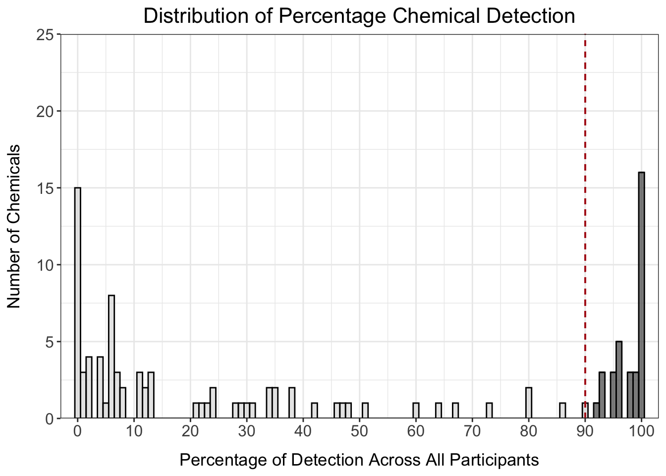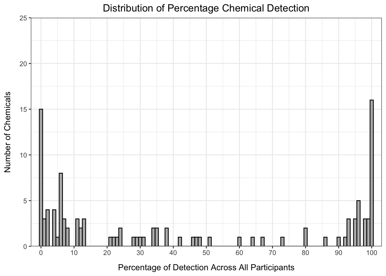 Next, we want to apply a chemical detection filter to remove chemicals from the dataset with very low detection. To start, let’s make a dataframe summarizing the percentage of participants in which each chemical was detected and graph this distribution using a histogram.