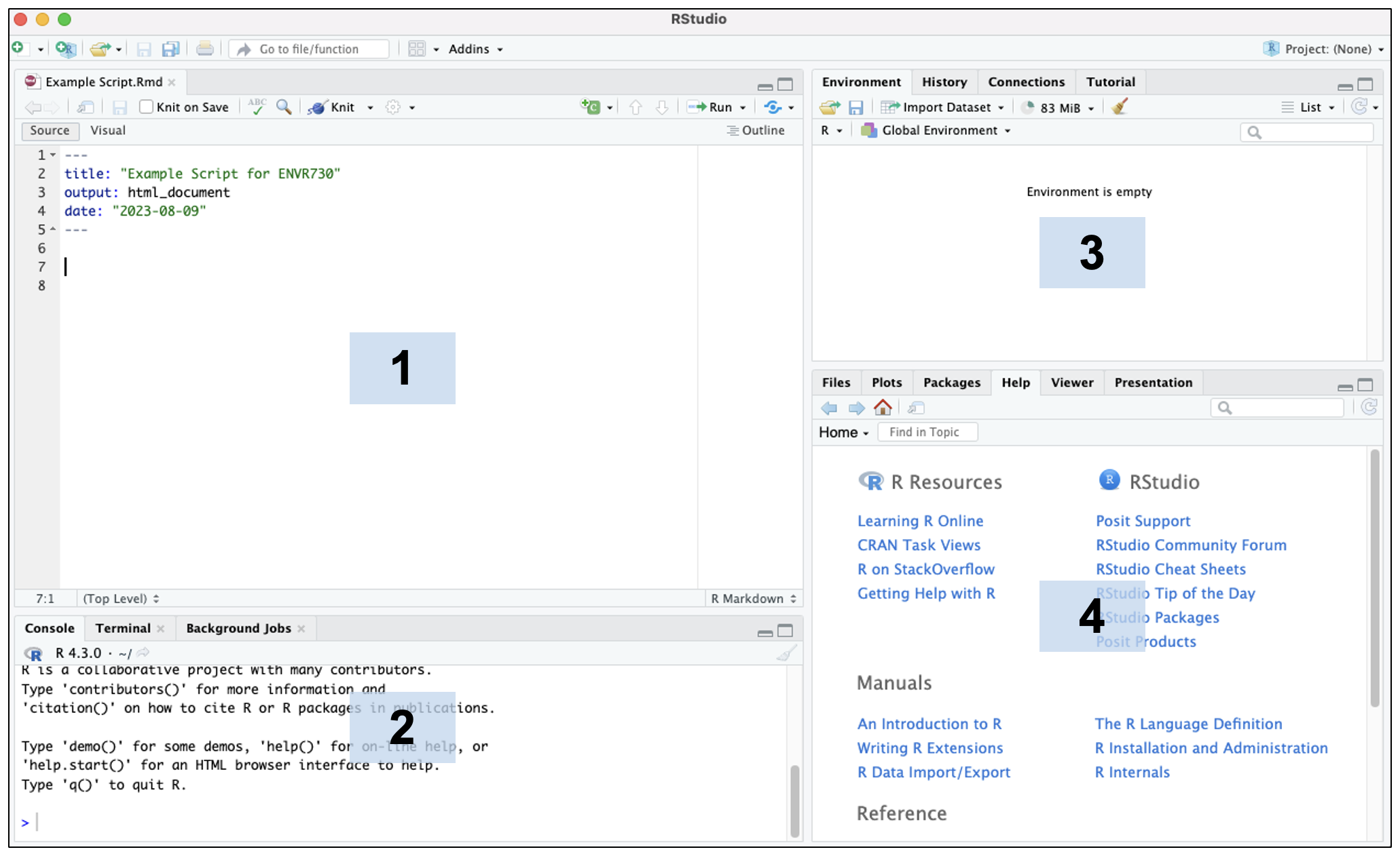 The default RStudio layout has four main panes (numbered above in the blue boxes):
