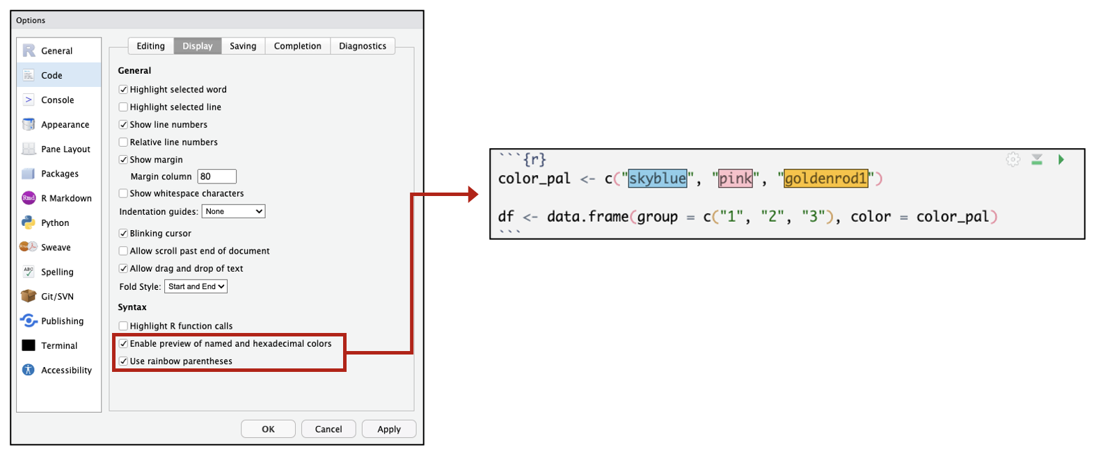 Under “Tools” → “Global Options,” RStudio panes can be customized to appear in different configurations or with different color themes. A number of other options can also be changed. For example, you can choose to have colors highlighted the color they appear or rainbow colored parentheses that can help you visualize nested code.