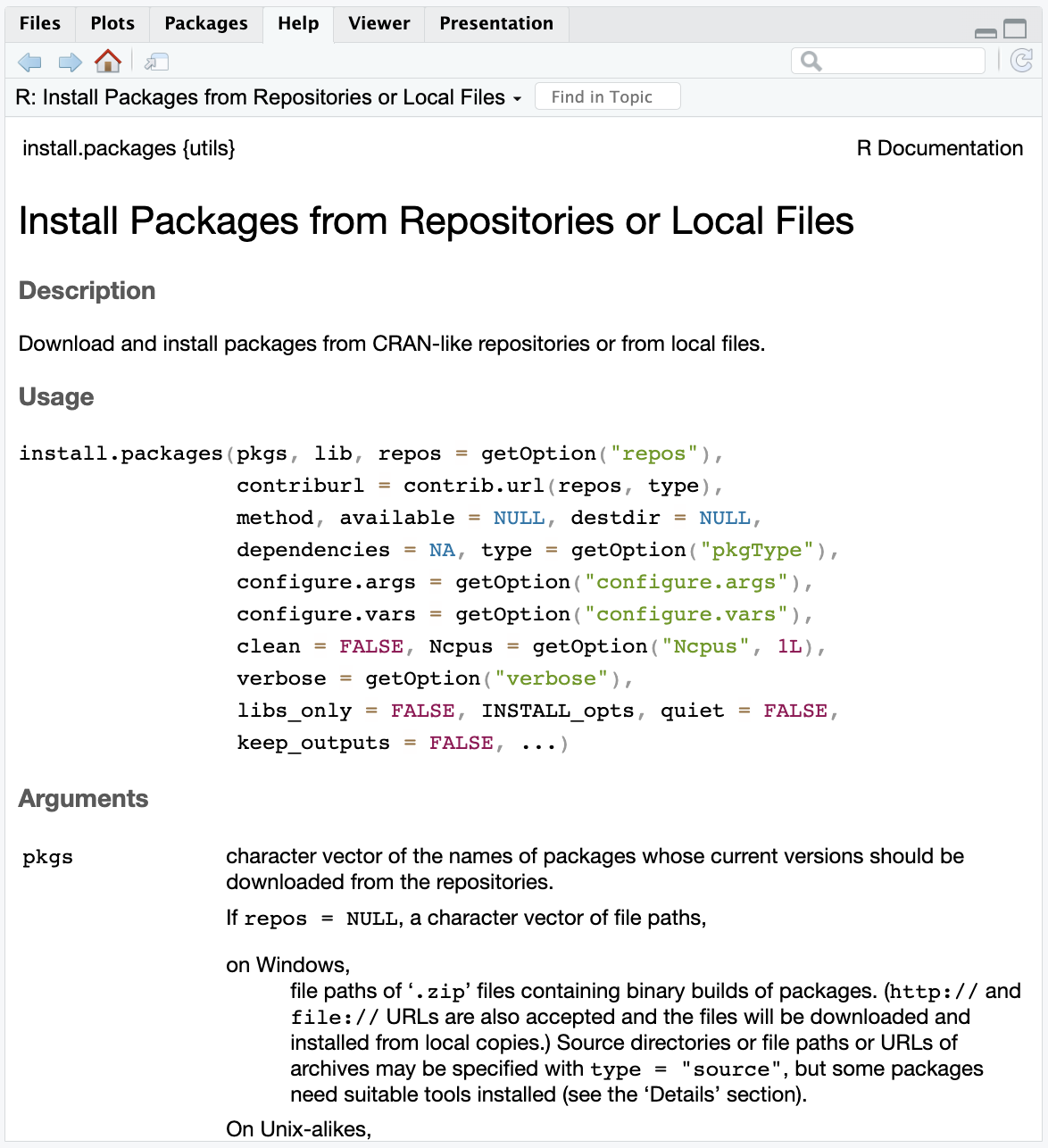 You can learn more about a function by typing one question mark before the name of the function, which will bring up documentation in the Help tab of the Viewer window. Importantly, this documentation includes a description of the different arguments that can be passed to the function and examples for how to use the function.