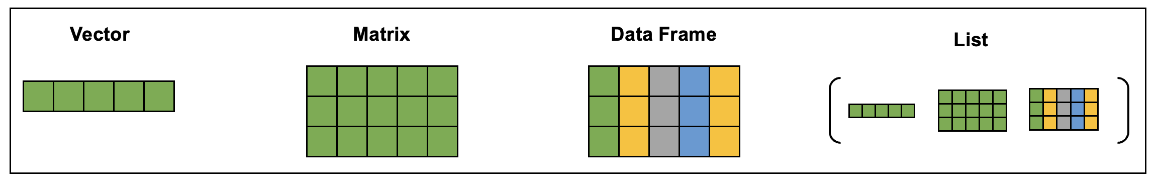 - Vectors: also known as an atomic vector, can contain characters, logical values, integers, or numeric values (but all elements must be the same data type).