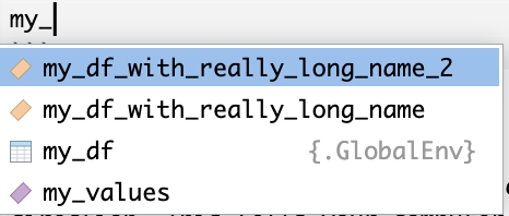 For example, let’s say we instead named our example data frame something much longer, and we had two data frames with similar names. If we start typing in my_ and pause our typing, all of the objects that start with that name will appear as options in a list. To select which one to autofill, navigate down the list and click return/enter.