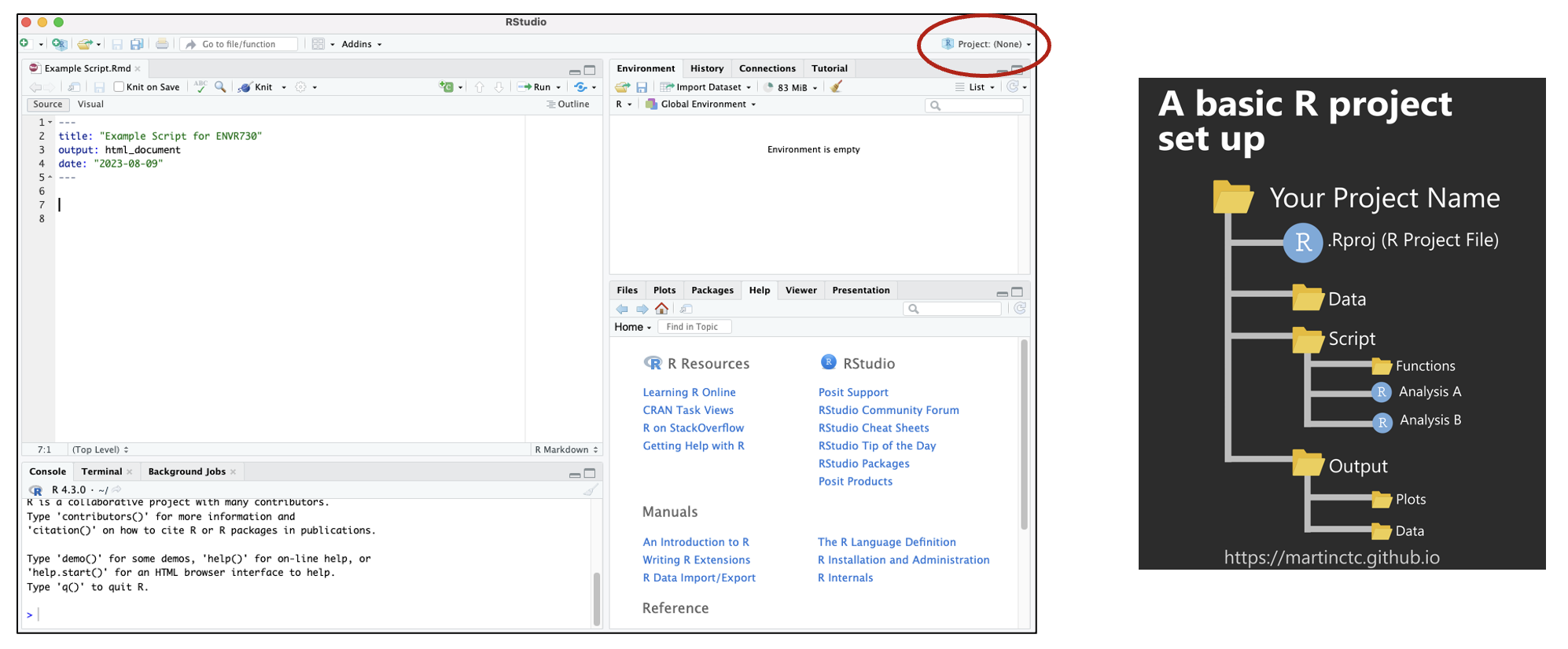 - Console: where you can type code that will execute immediately when you press enter/return. This is also where code from script files will appear when you run the code.