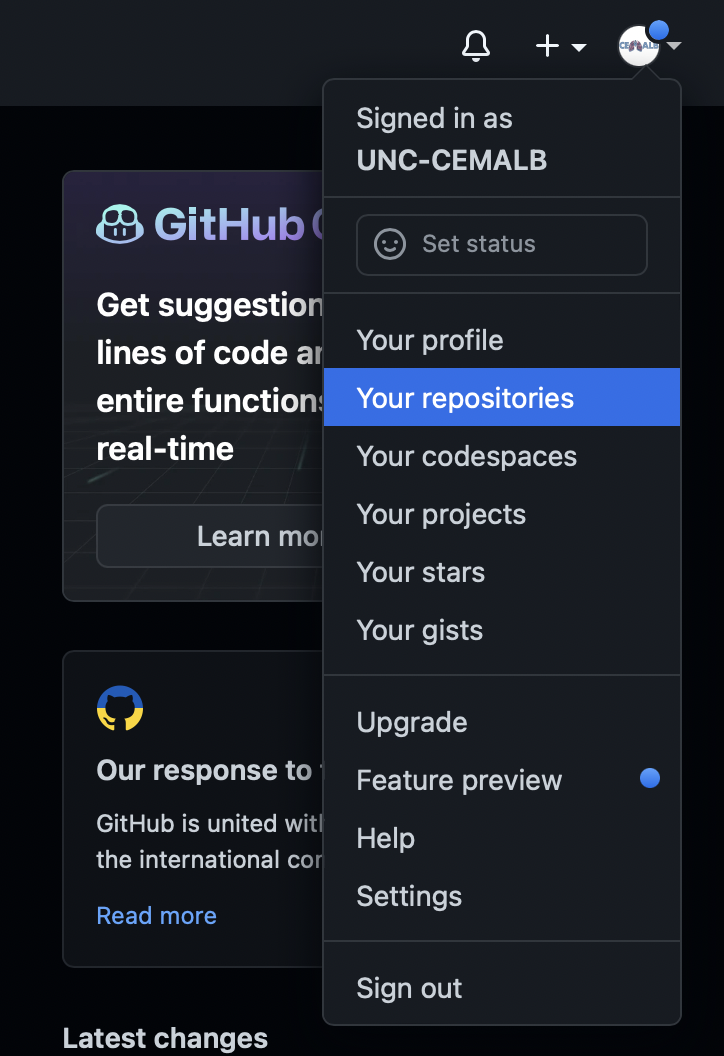 To access the repositories that are currently available to you through your user account, click the circle in top right-hand corner and click “Your repositories”.