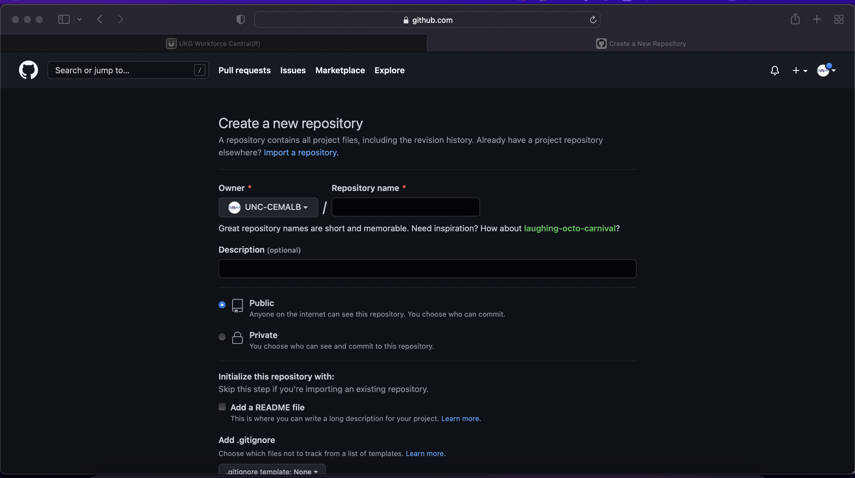 Then give your repository a descriptive name. We often edit the repo titles to match the title of specific manuscripts, though specific titling formats are up to the users/team’s preference.