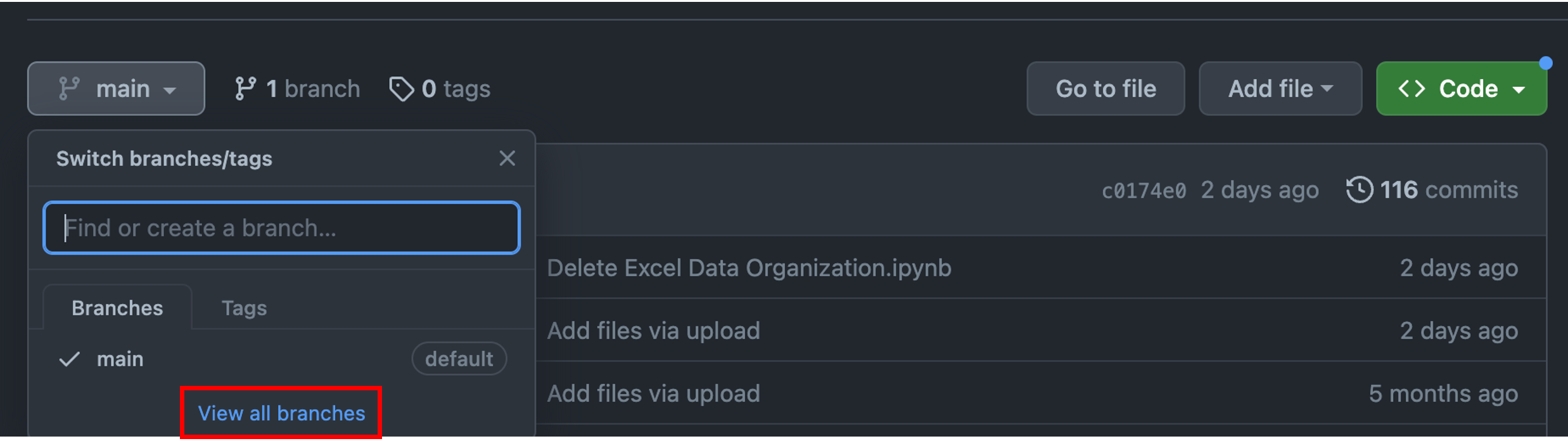 Let’s start by creating a new branch. First, navigate to a repository, select “main” and then “View all branches”.