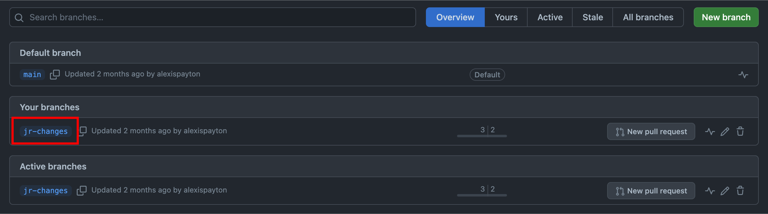 Click “New branch”, give your branch a title, and click “Create new branch”. In the screenshot, you’ll see the new branch entitled “jr-changes”.
