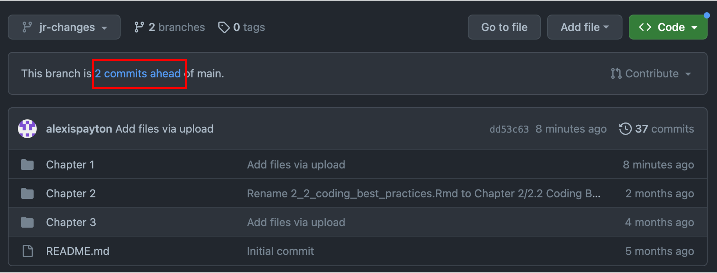 After uploading the file(s) to this branch, you’ll see a notification that this branch is now a certain number of commits ahead of the main branch. A commit records the number of changes to files in a branch. Based on the screenshot, “jr-changes” is now 2 commits ahead of “main”.