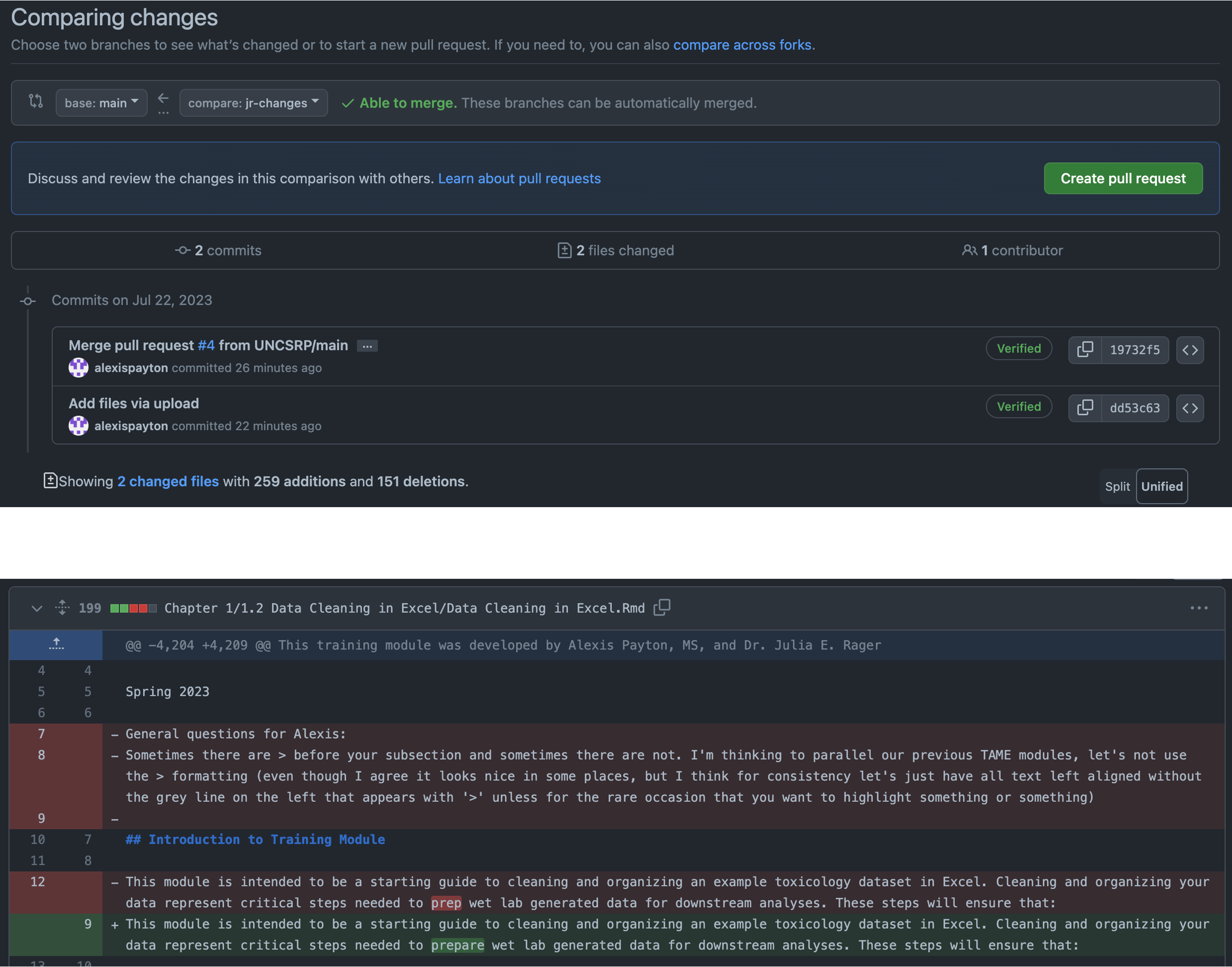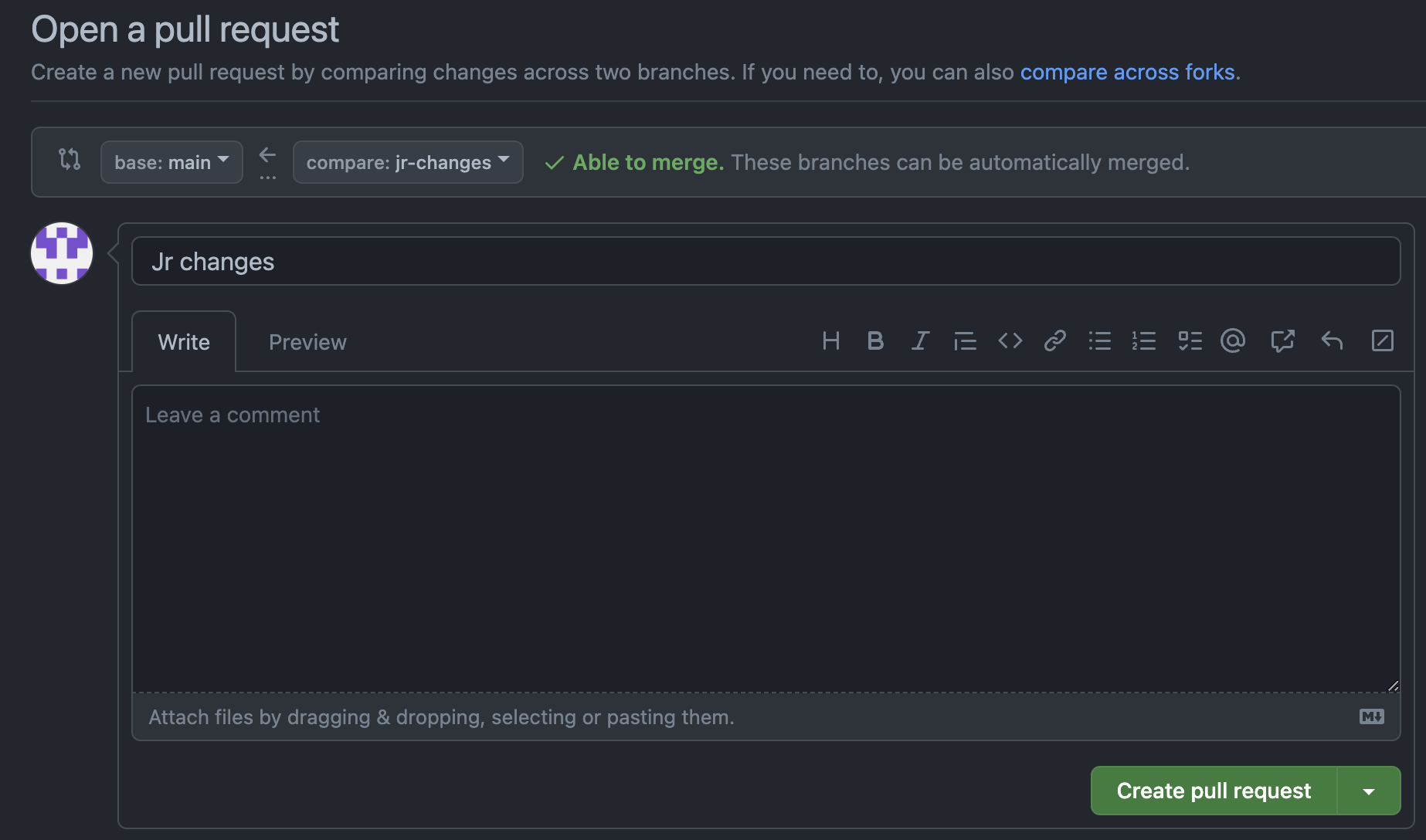 Click on “2 commits ahead” and scroll down to compare versions between the “main” and “jr-changes” branches. A pull request will need to be created. A pull request allows other collaborators to see changes made to a file within a branch. These proposed changes can be discussed and amended before merging them into the main branch. For more information, visit Github’s branches, pull requests and comparing branches in pull requests documentation.