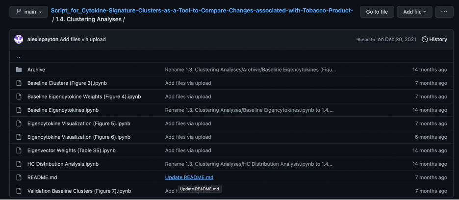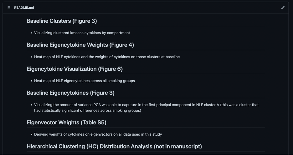 If the code is for a manuscript, it’s helpful to include the table or figure name it pertains to in the manuscript in parentheses. For example, “Baseline Clusters (Figure 3)”. This allows viewers to find find the code for each table or figure faster.