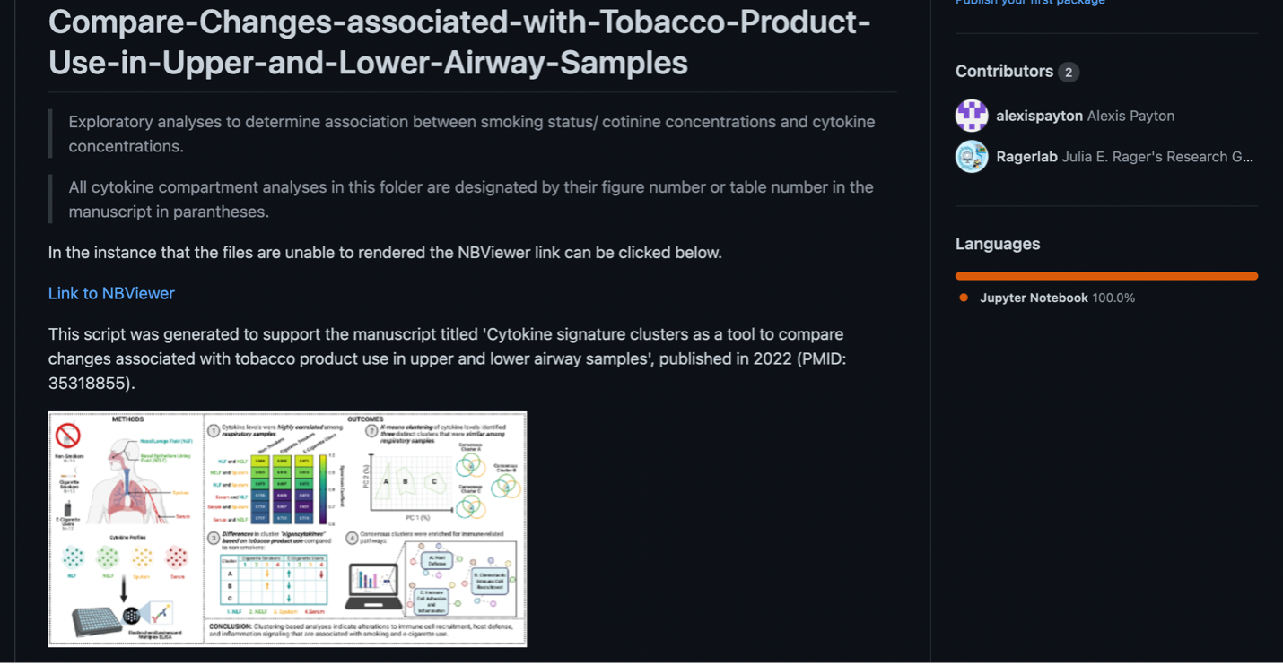 - If the code was written in the software Jupyter (ie. has the extension .ipynb not .R or .Rmd), NBViewer is a website that can render jupyter notebooks (files). This is helpful, because sometimes the files take too long to render, so link the repository from the NB viewer website.