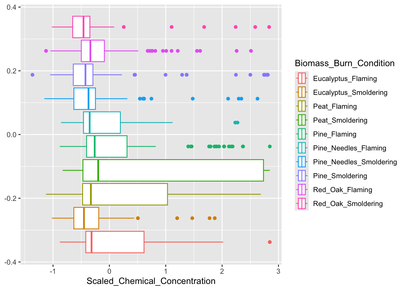 Based on the figure above, peat smoldering has the highest median scaled chemical concentration. However, this was difficult to determine given that the burn conditions aren’t labeled on the x axis and a sequential color palette was used, making it difficult to identify the correct boxplot with its burn condition in the legend. If you look closely, the colors in the legend are in a reverse order of the colors assigned to the boxplots. Let’s identify some elements of this graph that can be modified to make it easier to answer our research question.