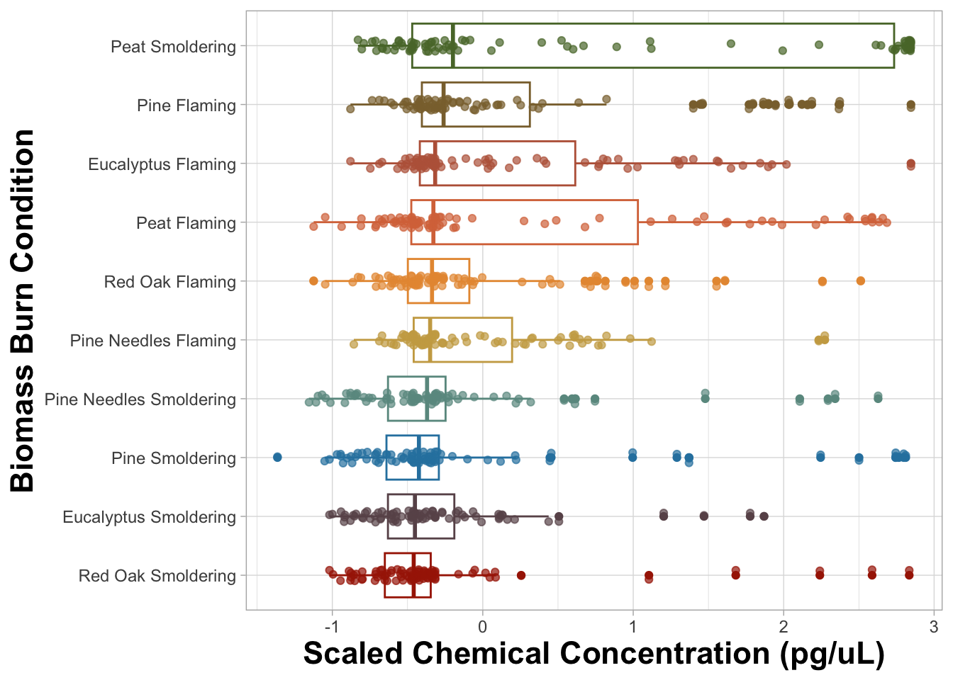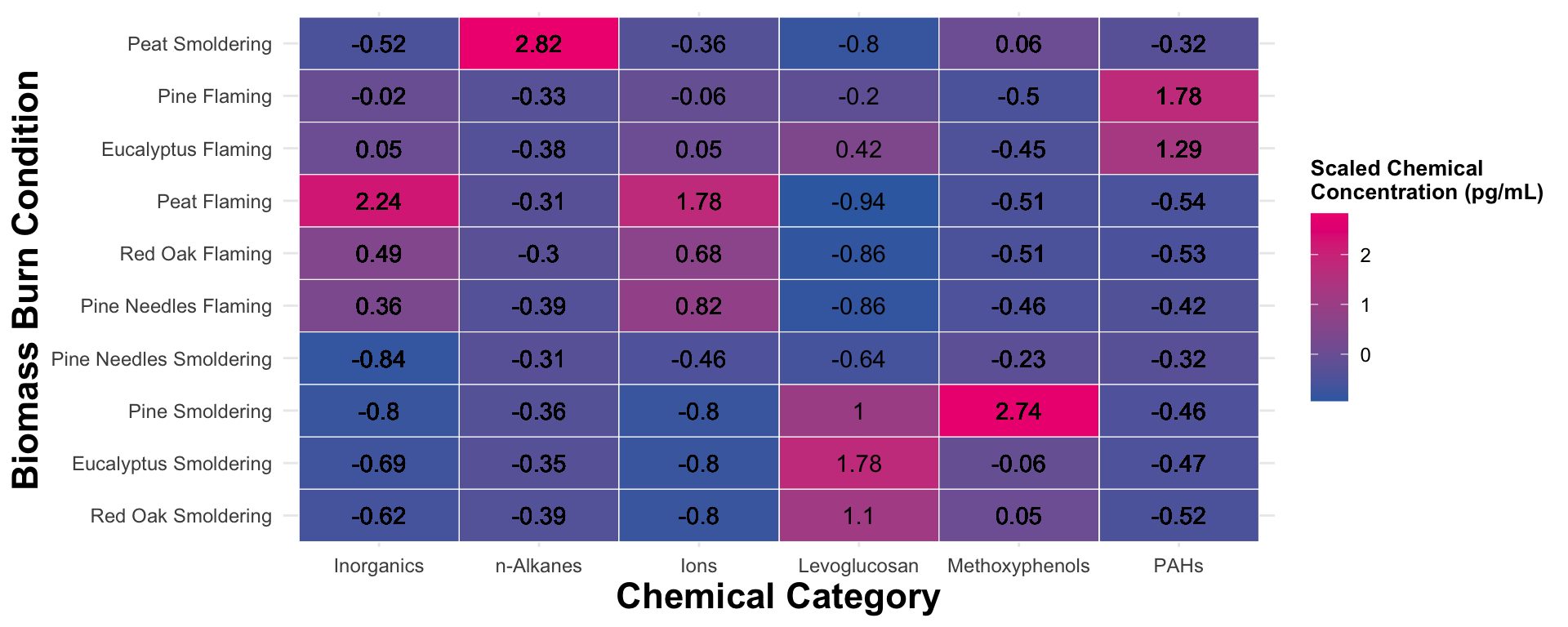 With this, we can answer Environmental Health Question #2: Which classes of chemicals show the highest concentrations across the evaluated biomass burn conditions?