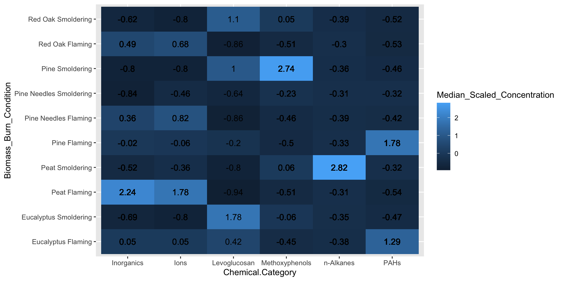 “Figure X. Chemical category concentrations across biomass burn conditions. Scaled chemical concentration values are based on the raw chemical concentration values scaled within each chemical. Chemical category on the x axis is ordered from highest to lowest median concentration from left to right. Biomass burn condition on the y axis is ordered from the highest to lowest median concentration from top to bottom. The values in each tile represent the median scaled chemical concentration.”
