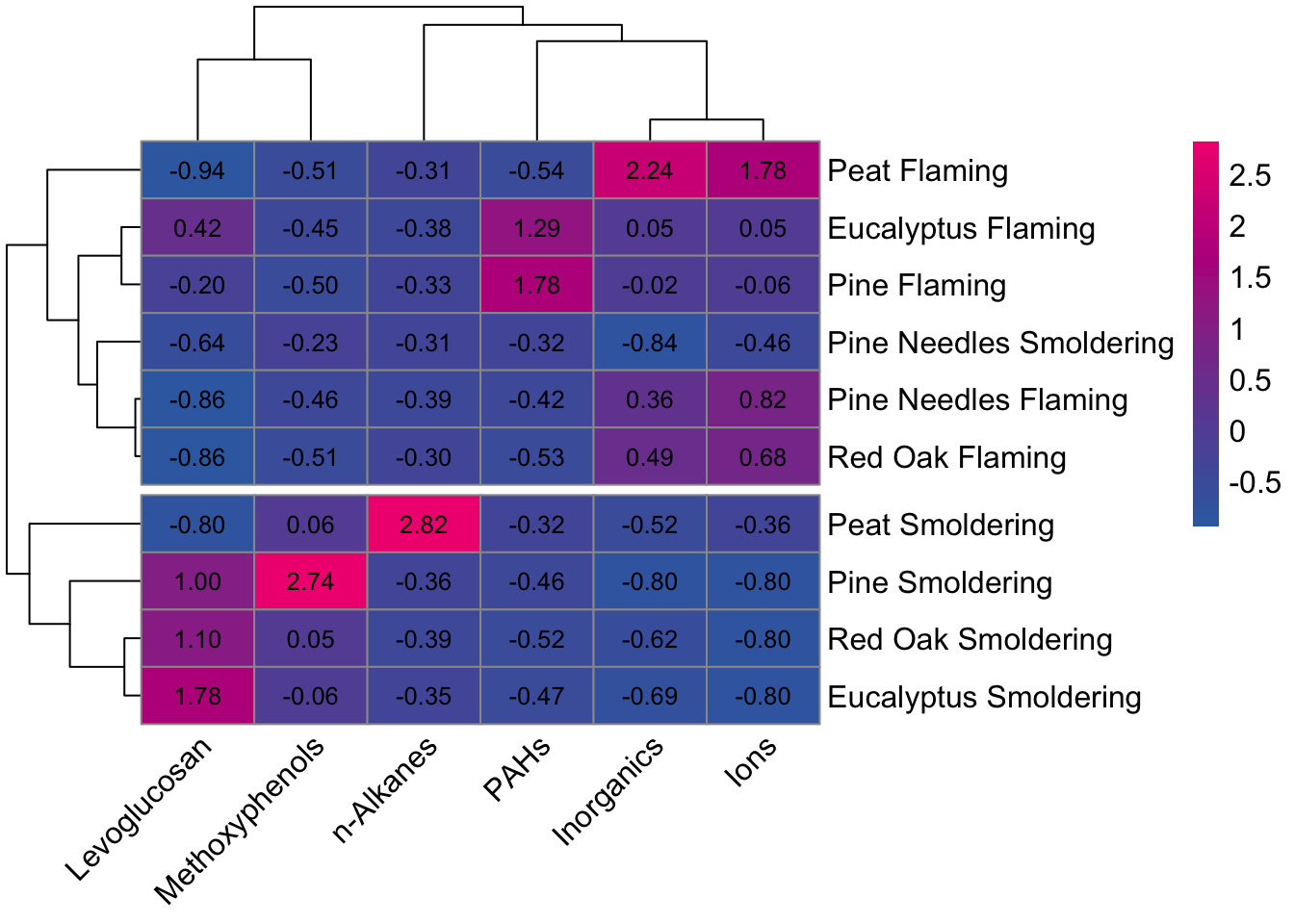 - Heatmap: Which classes of chemicals show the highest concentrations across the evaluated biomass burn conditions?