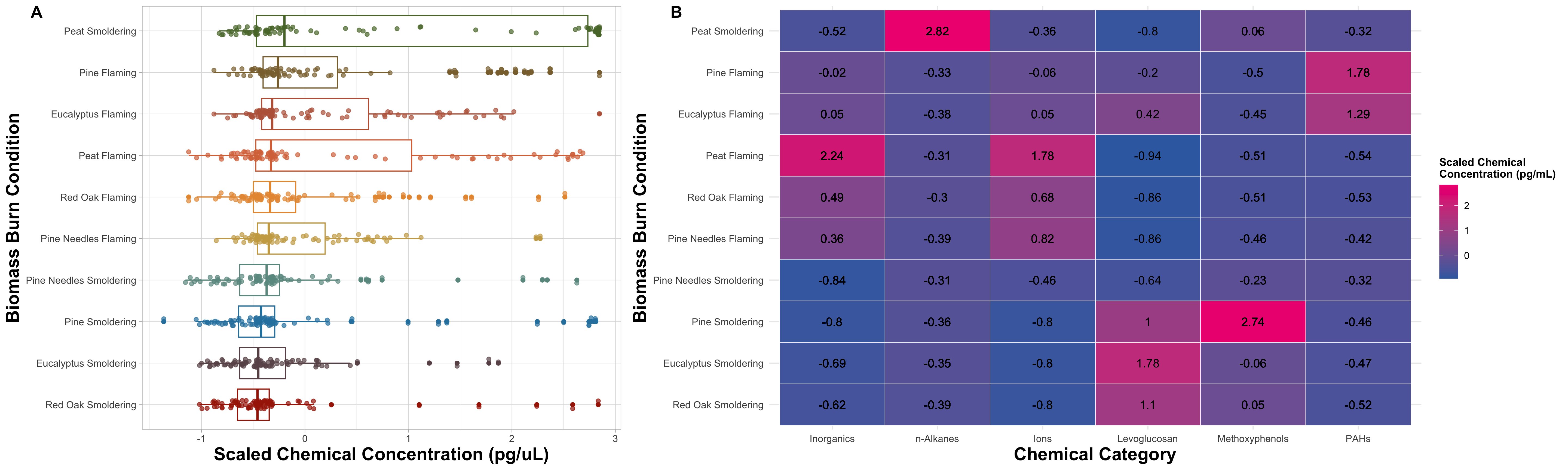 “Figure X. Chemical concentration distributions across biomass burn conditions. (A) The boxplots are based on the scaled chemical concentration values, which used the raw chemical concentrations values scaled within each chemical. The individual dots represent the concentrations of each chemical. The biomass burn conditions on the y axis are ordered from greatest (top) to least (bottom) based on median scaled chemical concentration. (B) The heatmap visualizes concentrations across chemical categories. Chemical category on the x axis is ordered from highest to lowest median concentration from left to right. Biomass burn condition on the y axis is ordered from the highest to lowest median concentration from top to bottom. The values in each tile represent the median scaled chemical concentration.
