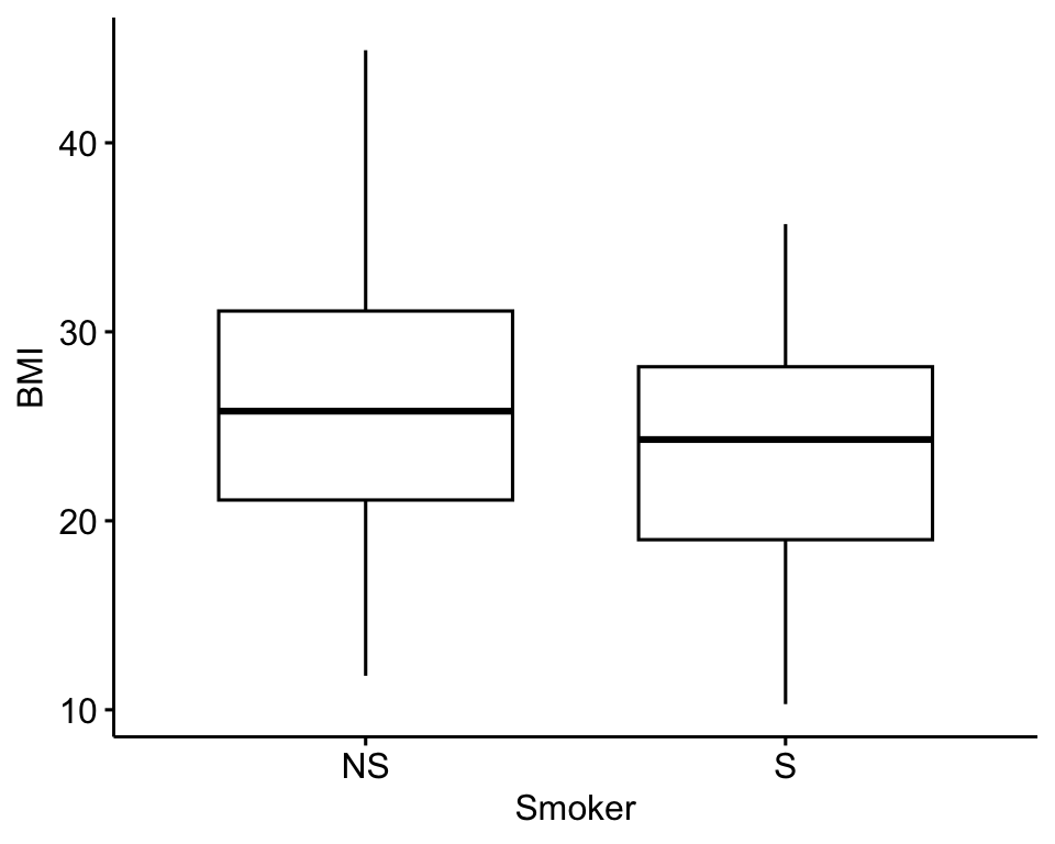 From this plot, it looks like non-smokers (labeled “NS”) may have significantly higher BMI than smokers (labeled “S”), though we need statistical evaluation of these data to more thoroughly evaluate this potential data trend.