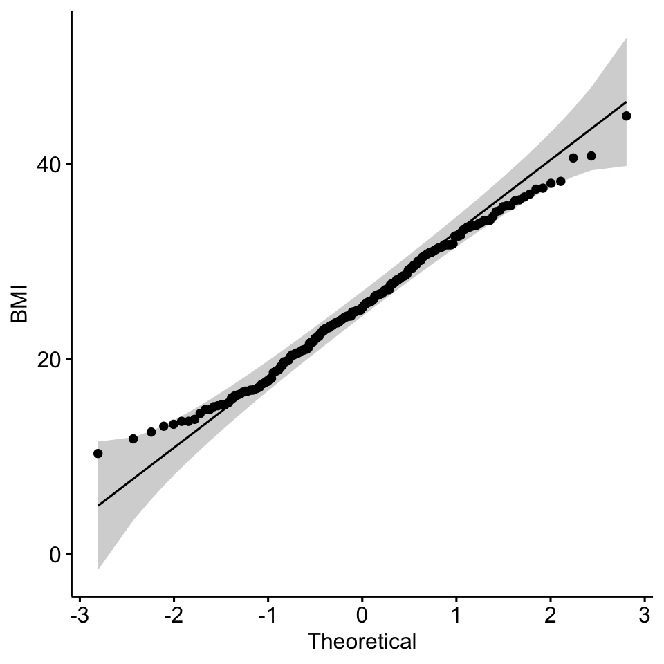 This test resulted in a p-value of 0.3773, so we cannot reject the null hypothesis (that the BMI data are normally distributed). These findings support the assumption that these data are normally distributed.
