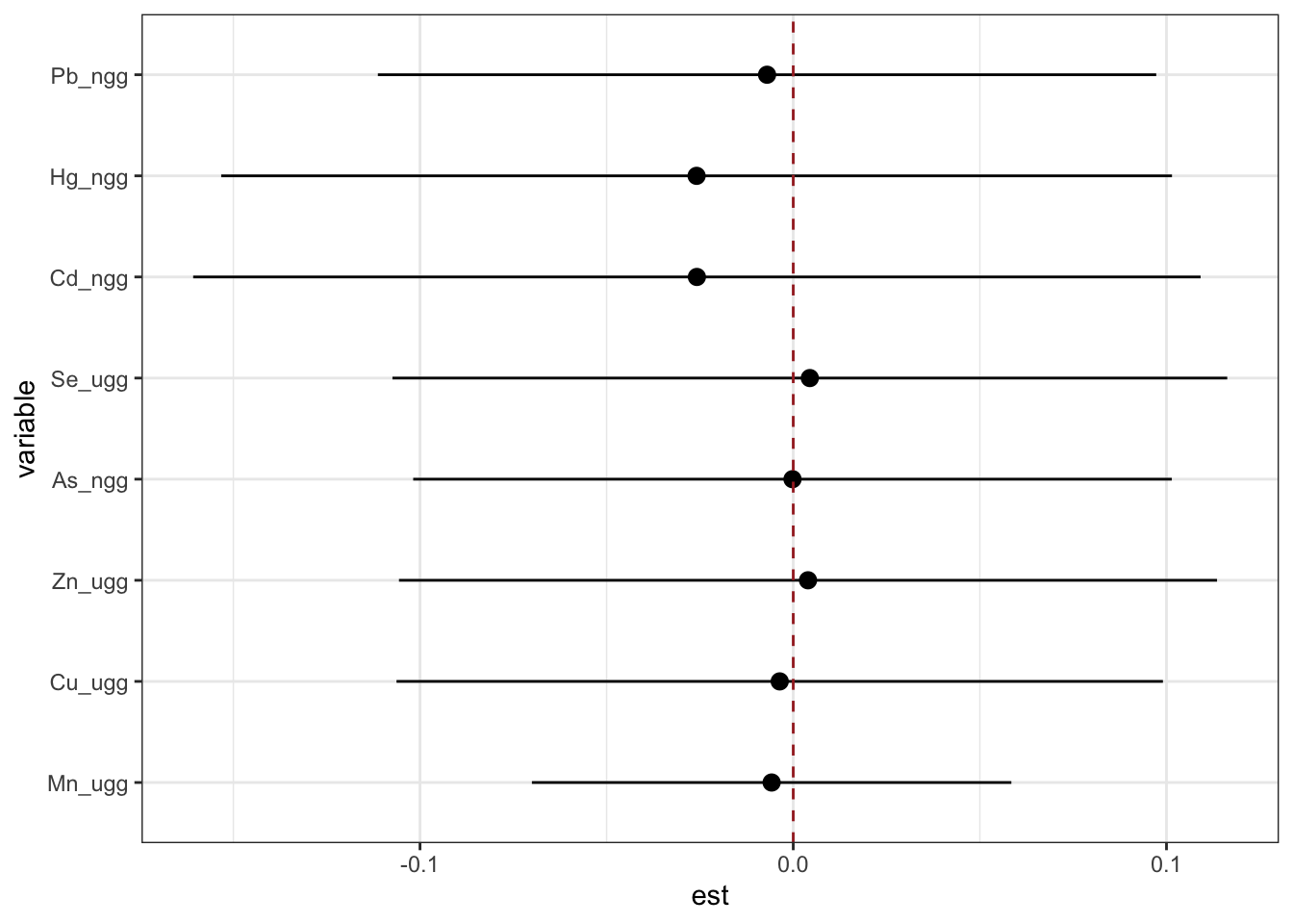 Then, we can generate a dataset that contains for each exposure (variable), the log(OR) (est) (and its standard deviation (sd)) corresponding to the odds of neonatal inflammation when an exposure is at its 75th compared to the odds when at the 25th percentile. The log(OR) is estimated at three levels of the other exposures (25th, 50th and 75th percentiles). We can use this dataset to identify odds ratios for neonatal inflammation (comparing the 75th to 25th percentile odds) for each exposure at differing levels of the other exposures. These odds ratios approximate risk, whereby an odds ratio >1 means there is increased risk of neonatal inflammation when that exposure is at its 75th percentile compared to its 25th percentile. We can then plot these data to see the logOR for each metal in relation to neonatal inflammation at varying levels of the rest of the exposures.