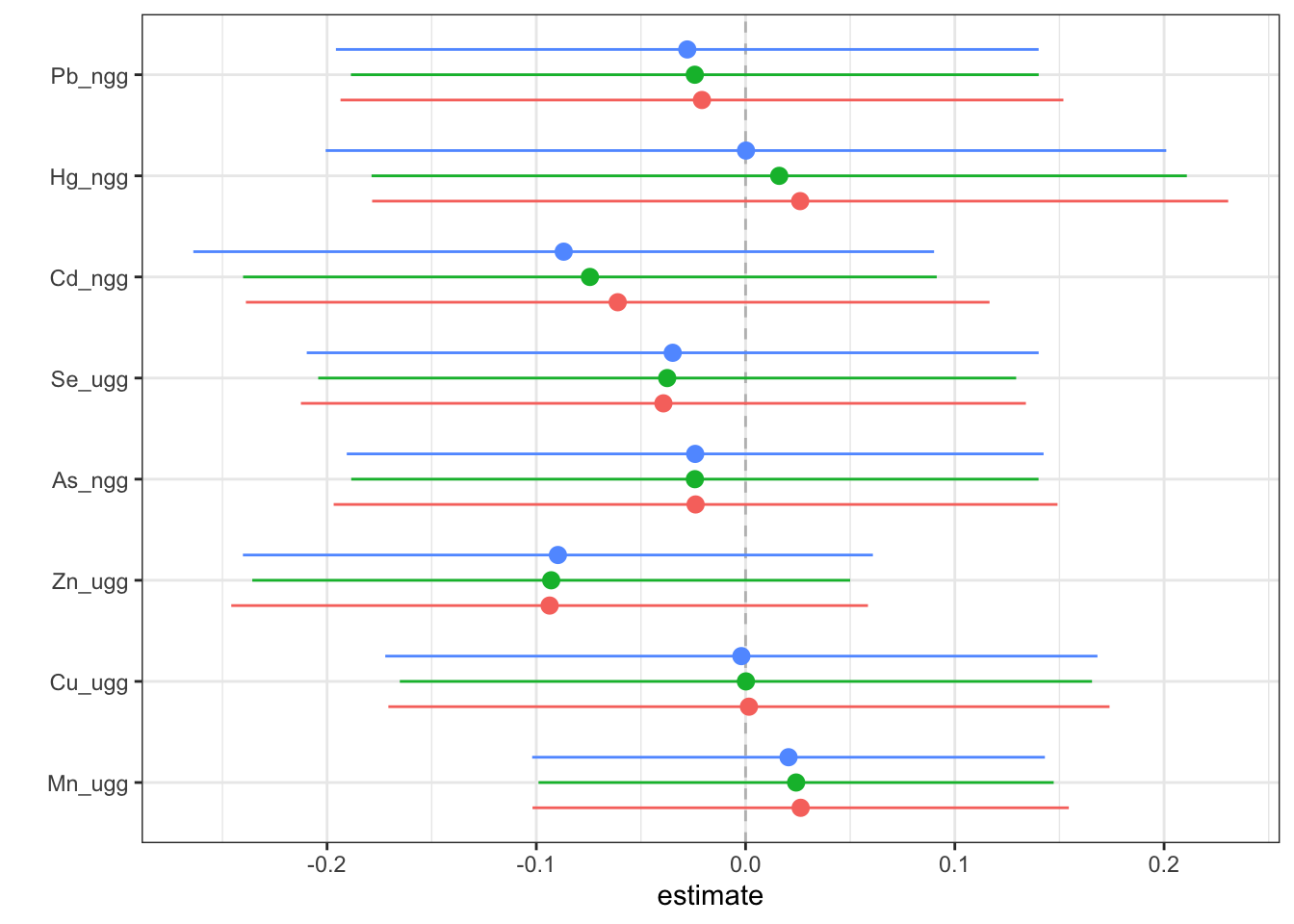 Answer: At all levels of the other exposures, lead, cadmium, selenium, arsenic and zinc reduce the odds of neonatal inflammation, while manganese and mercury appear to increase the odds of neonatal inflammation. Copper appears has a null effect. Notice that the credibility intervals however for all metals span the null meaning we are not confident in the independent effect of any of the metals.
