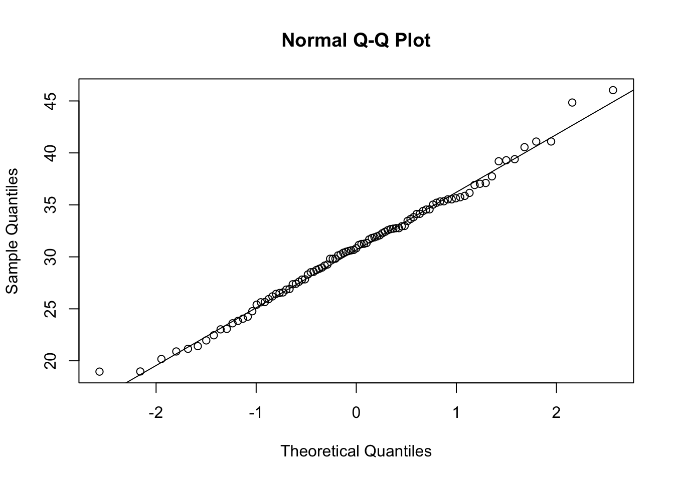 Small variations from the reference line, as seen above, are to be expected for the most extreme values. Overall, we can see that the age data are relatively normally distributed, as the points fall along the reference line.