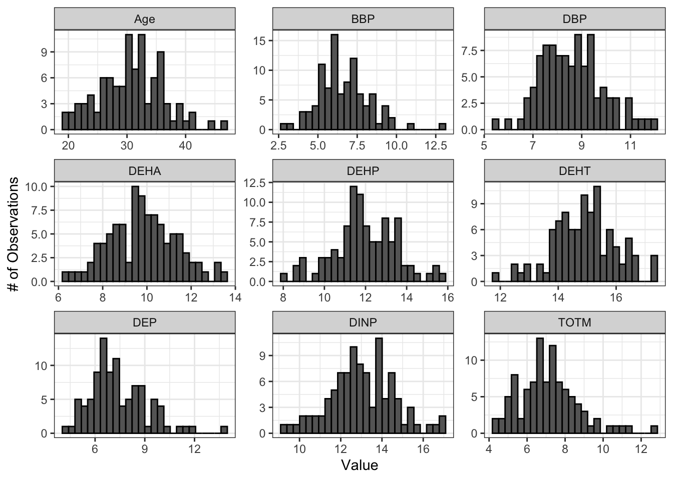 labs(y = "# of Observations", x = "Value")