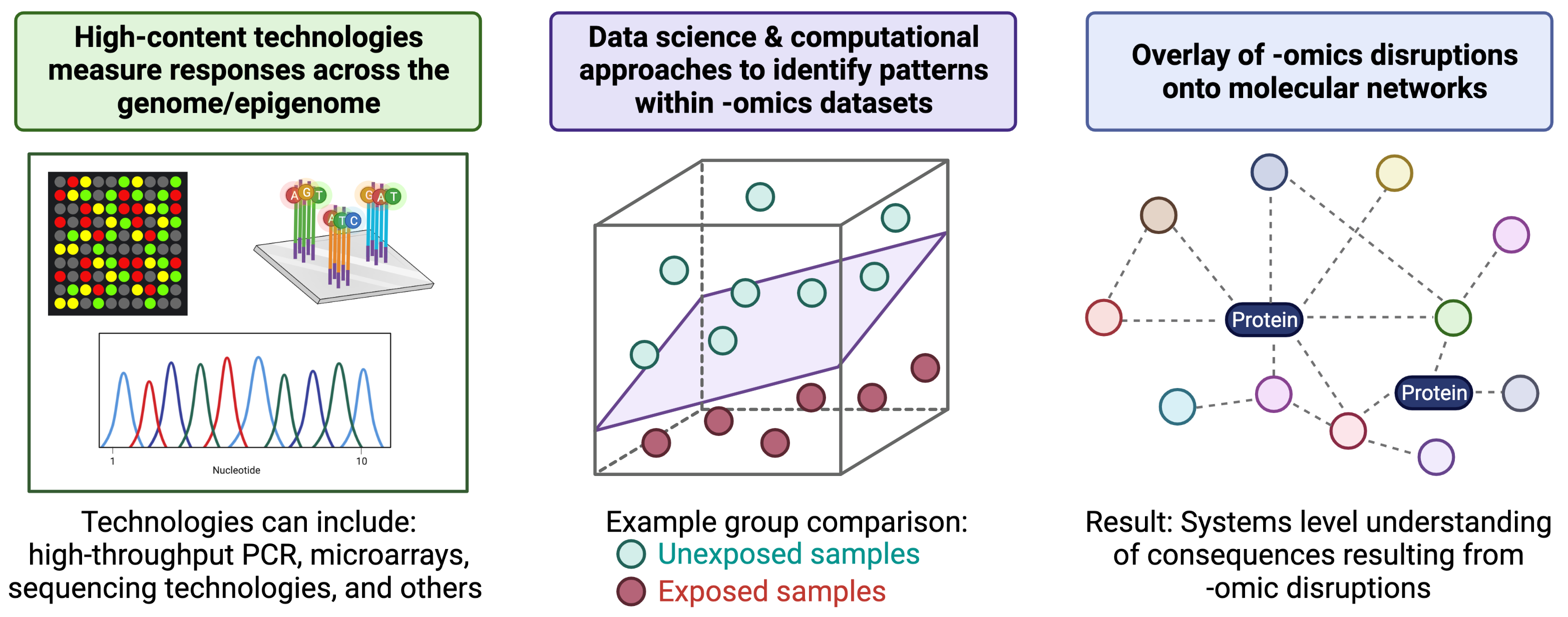 Traditional molecular biology techniques typically evaluate the function(s) of individual genes and gene products. Omics-based methods, on the other hand, utilize non-targeted methods to identify many to all genes or gene products in a given environmental/biological sample. These non-targeted approaches allow for the unbiased investigation of potentially unknown or understudied molecular mediators involved in regulating cell health and disease. These molecular profiles have the potential of being altered in response to toxicant exposures and/or during disease initiation/progression.