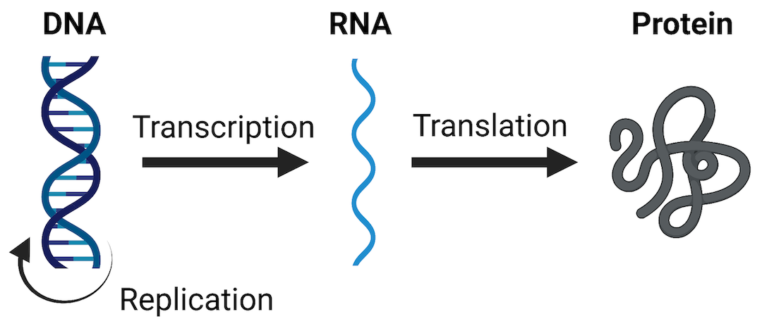 One of the most widely evaluated -omics endpoints is messenger RNA (mRNA) expression (also termed gene expression). As a reminder, mRNA molecules are a major type of RNA produced as the “middle step” in the Central Dogma Theory, which describes how genetic DNA is first transcribed into RNA and then translated into protein. Protein molecules are ultimately the major regulators of cellular processes and overall health. Therefore, any perturbations to this process (including changes to mRNA expression levels) can have tremendous consequences on overall cell function and health. A visualization of these steps in the Central Dogma theory are included below.