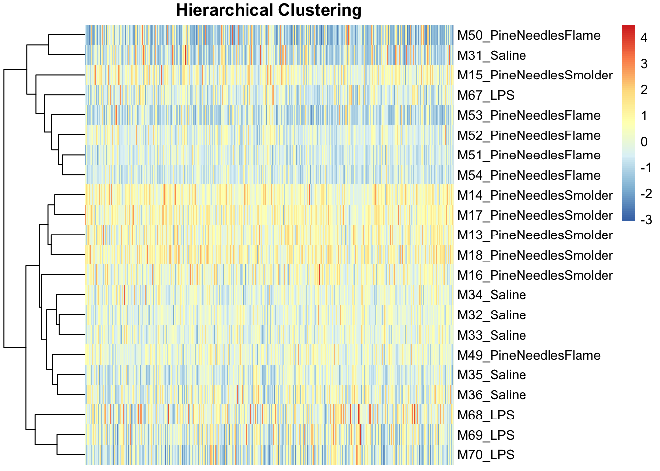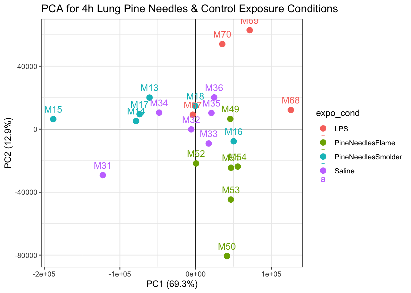 Here, we specifically analyze mRNA sequencing profiles collected in mouse lung tissues. These mice were exposed to two different biomass burn scenarios: smoldering pine needles and flaming pine needles, representing certain wildfire smoke exposure scenarios that can occur. The goal of these analyses is to identify which genes demonstrate altered expression in response to these wildfire-relevant exposures, and identify which biological pathways these genes influence to evaluate findings at the systems biology level.