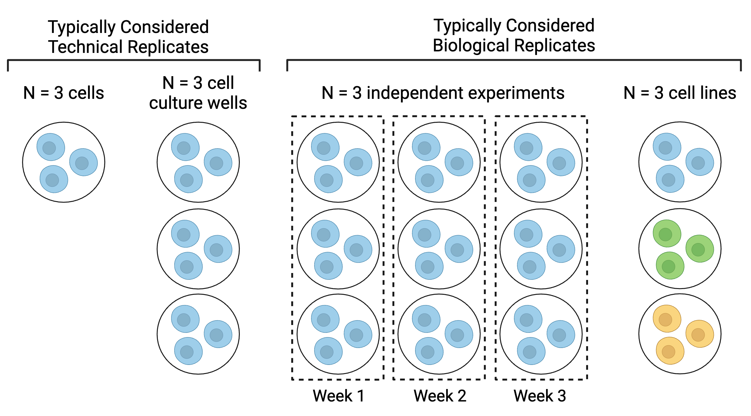 The final “N” that you report should reflect your biological replicates, or independent experiments. What constitutes an independent experiment or biological replicate is highly field-, lab-, organism-, and endpoint-dependent, so make sure to discuss this within your research group in the experiment planning phase and again before your analysis begins. No matter what you choose, ensure that when you report your results, you are transparent about what your biological replicates are. For example, the below diagram (adapted from BitesizeBio) illustrates different ways of defining replicates in experiments with cell lines: