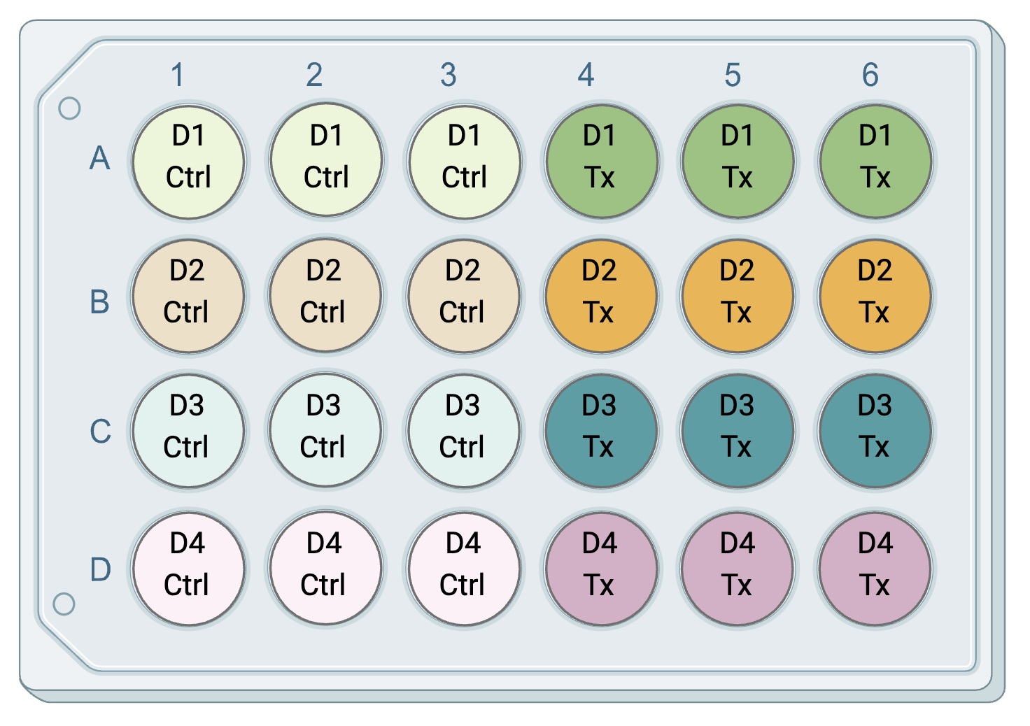 Technical replicates are repeated measurements on the same sample or biological source, demonstrating the variation underlying protocols, equipment, and sample handling. In environmental health research, there can be technical replicates separately related to either the experimental design or the downstream analyses. Technical replicates related to experimental design refer to the chemical exposure for cell-based (in vitro) experiments, where there may be multiple wells of cells from the same passage or human/mouse exposed to the same treatment. Technical replicates related to downstream analyses refer to the endpoints that are measured after chemical exposure in each sample. To illustrate this, consider an experiment where cells from four unique human donors (D1-D4) are grown in cell culture plates, and then three wells of cells from each donor are exposed to a chemical treatment (Tx) or a vehicle control (Ctrl). The plate layout might look something like this, with technical replicates related to experimental design, i.e. chemical exposure, in the same color: