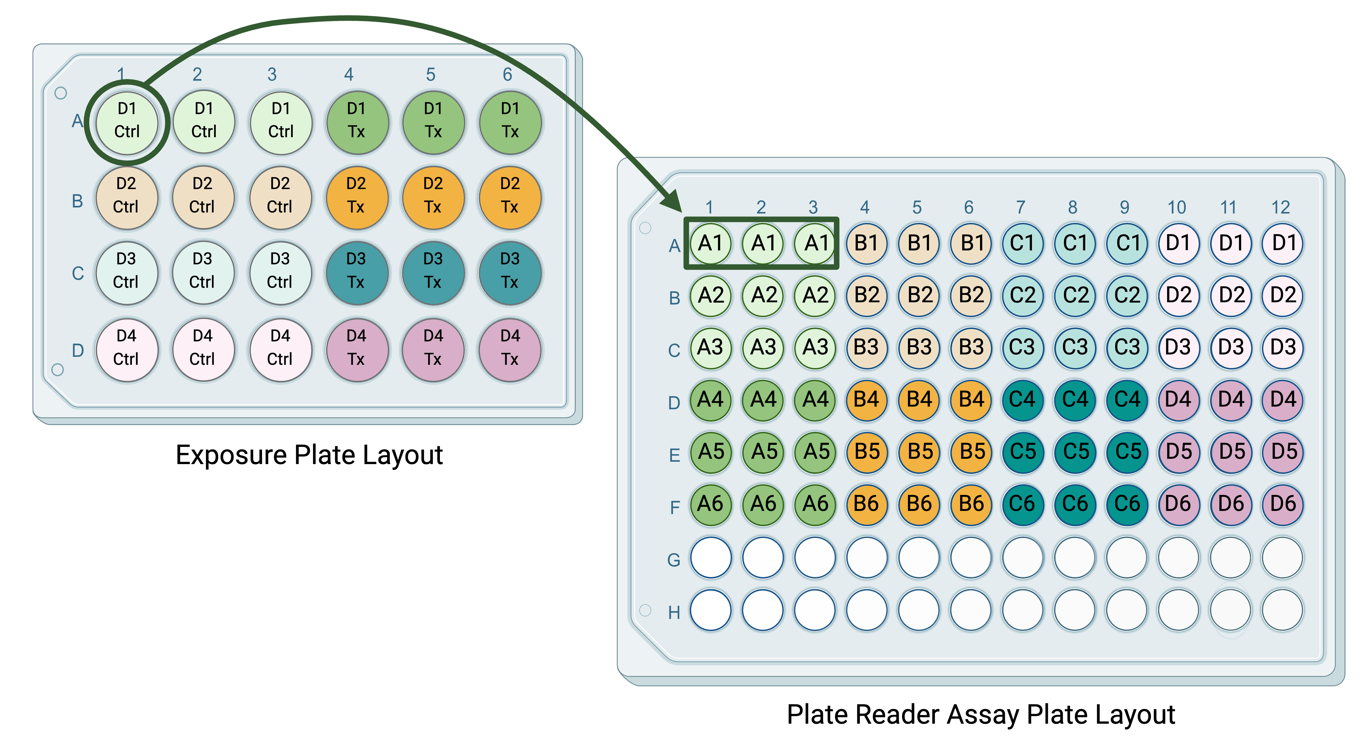 Following the exposure of the cells to a chemical of interest, the media is collected from each well and assayed using a plate reader assay for concentrations of a marker of inflammation. For each sample collected (from each well), there are three technical replicates used to measure the concentration of the inflammatory marker. The purpose of these technical replicates is to capture potential unintended well-to-well variation in the plate reader assay. The plate layout might look something like this, with the letter and number in each well of the plate layout representing the well in the exposure plate layout that the media sample being assayed came from: