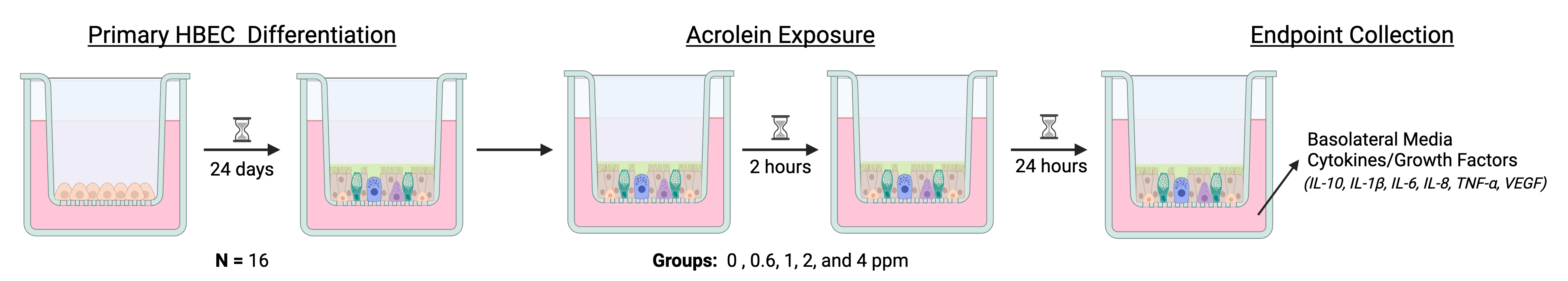 In this experiment, primary human bronchial epithelial cells (HBECs) from sixteen different donors were exposed to the gas acrolein, which is emitted from the combustion of fossil fuels, tobacco, wood, and plastic. Inhalation exposure to acrolein is associated with airway inhalation, and this study aimed to understand how exposure to acrolein changes secretion of markers of inflammation. Prior to experimentation, the HBECs were grown on a permeable membrane support for 24 days with air on one side and liquid media on the other side, allowing them to differentiate into a form that is very similar to what is found in the human body. The cells were then exposed for 2 hours to 0 (filtered air), 0.6, 1, 2, or 4 ppm acrolein, with two technical replicate wells from each donor per dose. Twenty-four hours later, the media was collected, and concentrations of inflammatory markers were measured using an enzyme-linked immunosorbent assay (ELISA).