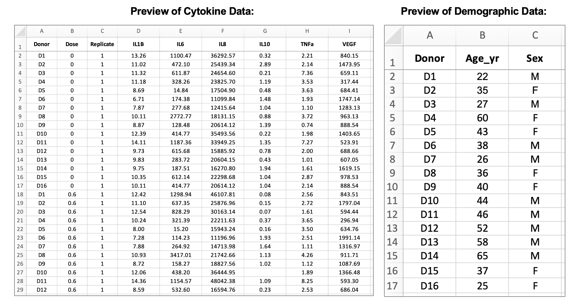 Next, let’s familiarize ourselves with the data that resulted from this experiment. There are two input data files, one that contains cytokine concentration data and one that contains demographic information about the donors:
