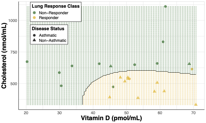 Figure 5. Decision boundary plot for SVM model predicting lung response class. Cholesterol and 25-hydroxyvitamin D were used as predictors visualizing responder status [non-responders(green) and responders (yellow)] and disease status [non-asthmatics (triangles) and asthmatics (circles)]. The shaded regions are the model’s prediction of a subject’s lung response class at a given cholesterol and 25-hydroxyvitamin D concentration.