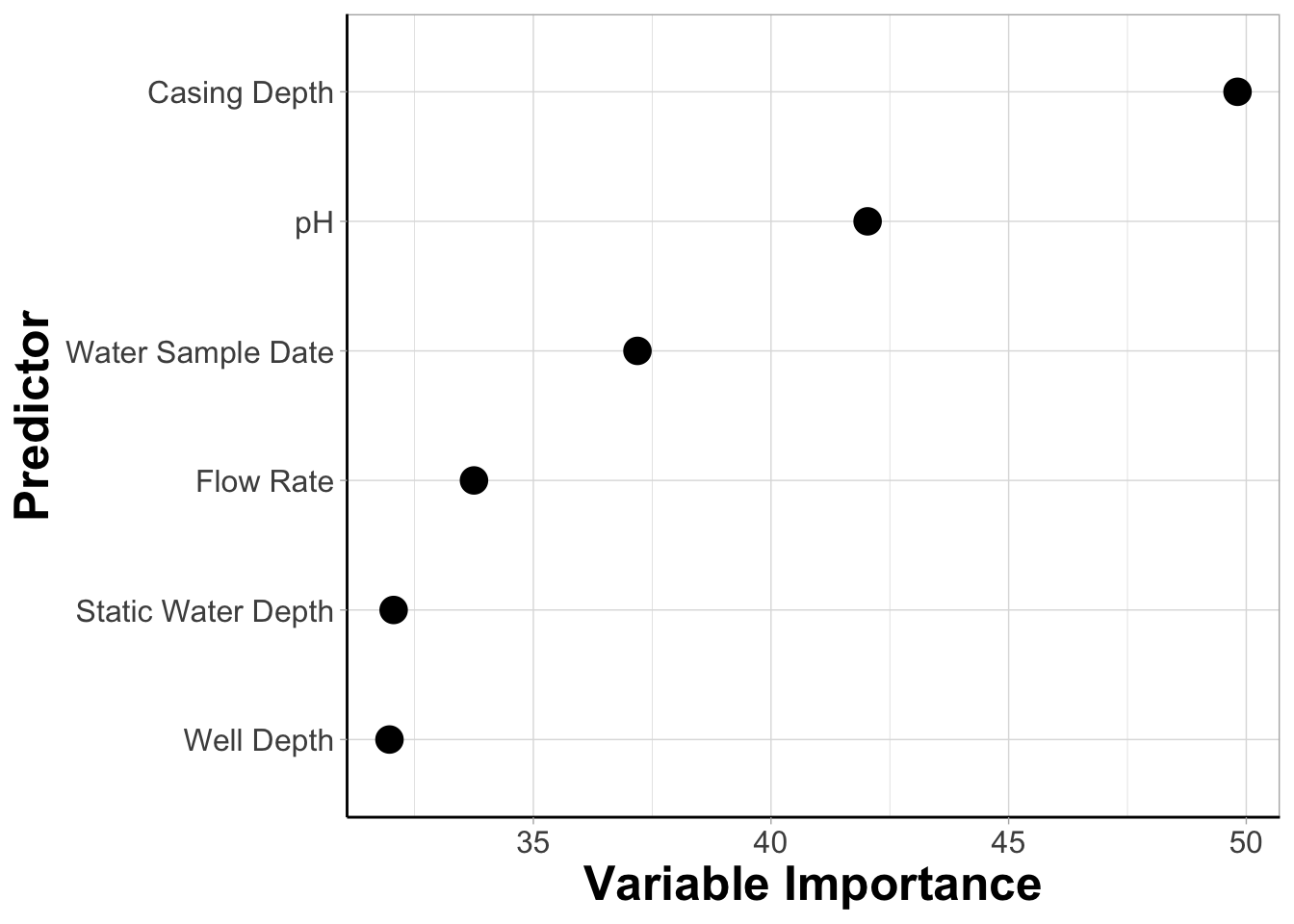 In the previous module, we investigated whether a classification-based RF model using well water variables would be accurate predictors of inorganic arsenic (iAs) contamination. While it is helpful to know if certain variables are able to be used to construct a model that accurately predict detectability, from a public health standpoint, it is also helpful to know which of those features contribute the most to a model’s accuracy. Therefore, if we can identify the features that are associated with having lower arsenic detection, we can use that information to inform policies when new wells are constructed. In addition to identifying variables with the greatest importance to the algorithm, it is also pertinent to understand the ranges of when a well is more or less likely to have arsenic detected. For example, are wells with a lower flow rate more likely to have arsenic detected? In this module, this will be addressed by extracting variable importance from the same algorithm and plotting it. The two features with the highest variable importance will be identified and used to construct a decision boundary plot to determine how features are associated with iAs detection.