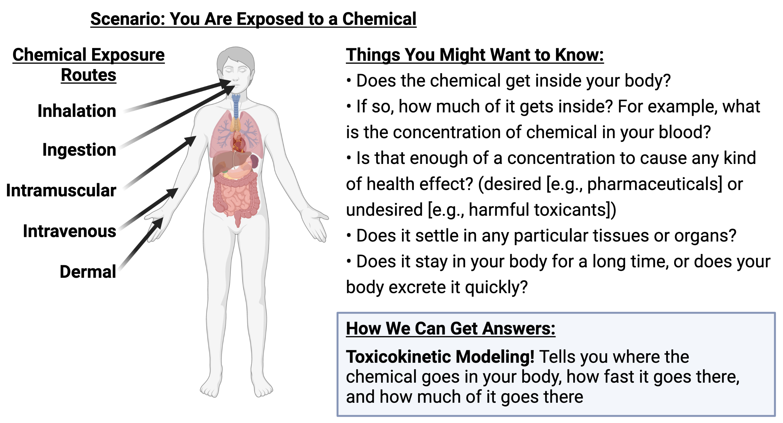Simply put, toxicokinetics answers these questions by describing “what the body does to the chemical” after an exposure scenario.