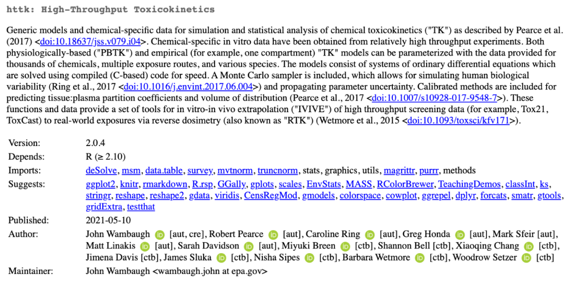Pearce RG, Setzer RW, Strope CL, Wambaugh JF, Sipes NS. httk: R Package for High-Throughput Toxicokinetics. J Stat Softw. 2017;79(4):1-26. PMID 30220889.