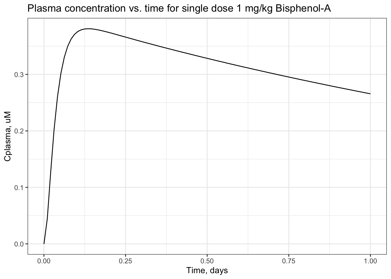 After solving the TK model that evaluates bisphenol-A, what is the maximum concentration of bisphenol-A estimated to occur in human plasma, after 1 exposure dose of 1 mg/kg/day?