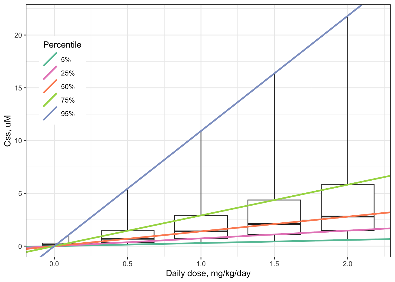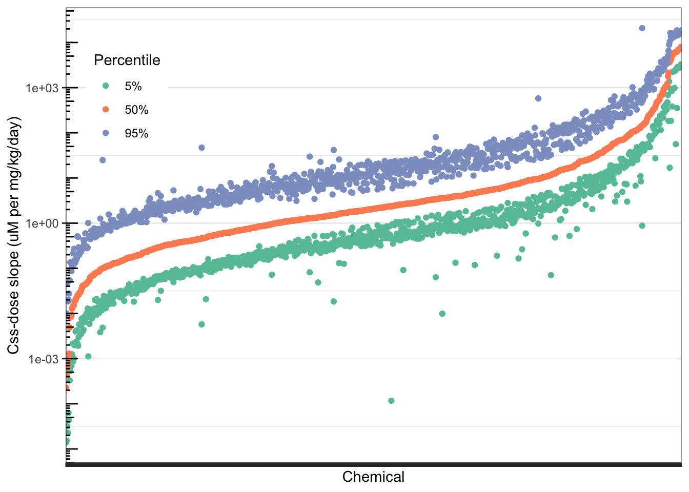 Considering the chemicals evaluated in the above TK modeling example, do the \(C_{ss}\)-dose slope distributions become wider as the median \(C_{ss}\)-dose slope increases?